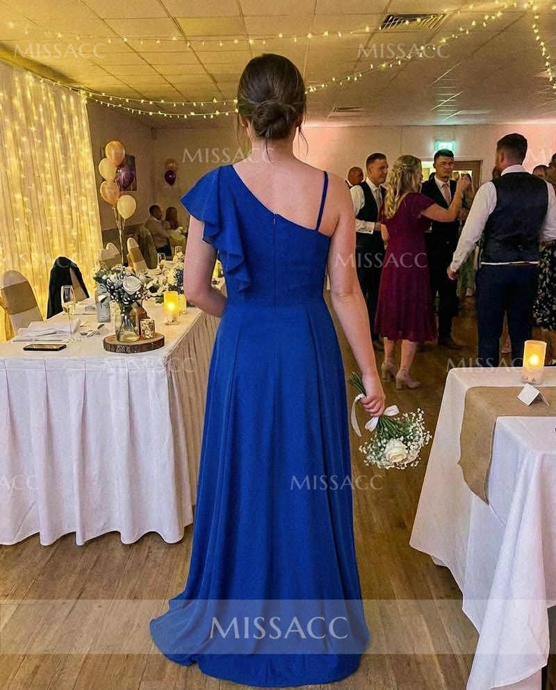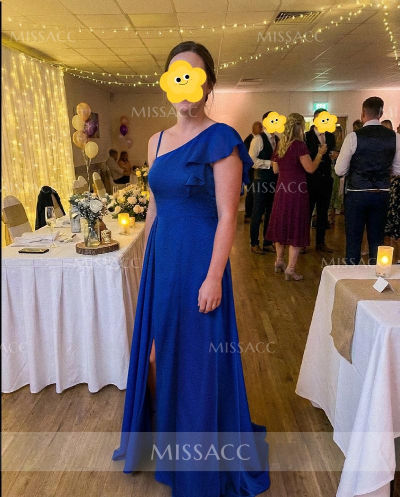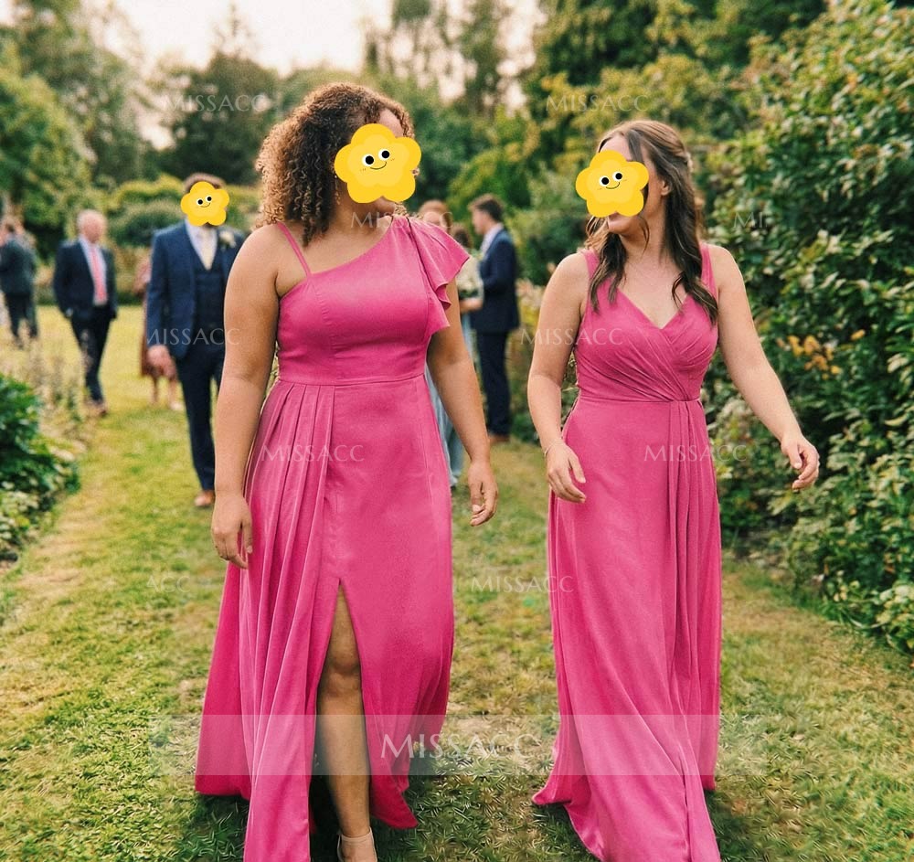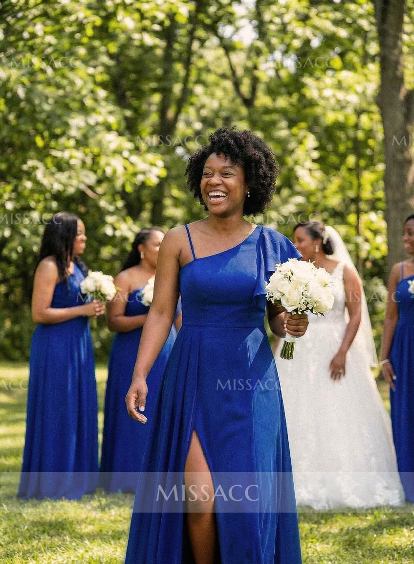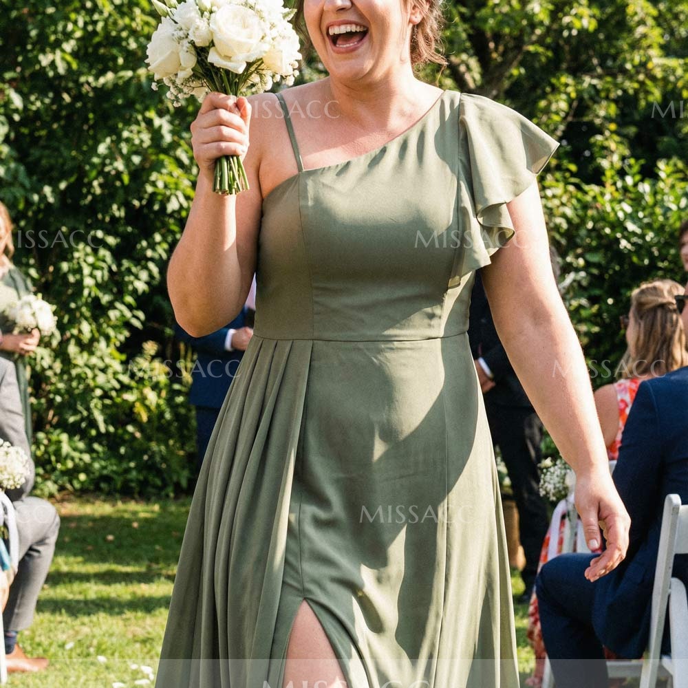 Discover our chic A-line bridesmaid dresses, crafted with asymmetrical jersey and a ruffle high split for a modern, elegant touch. Perfect for weddings and special events.