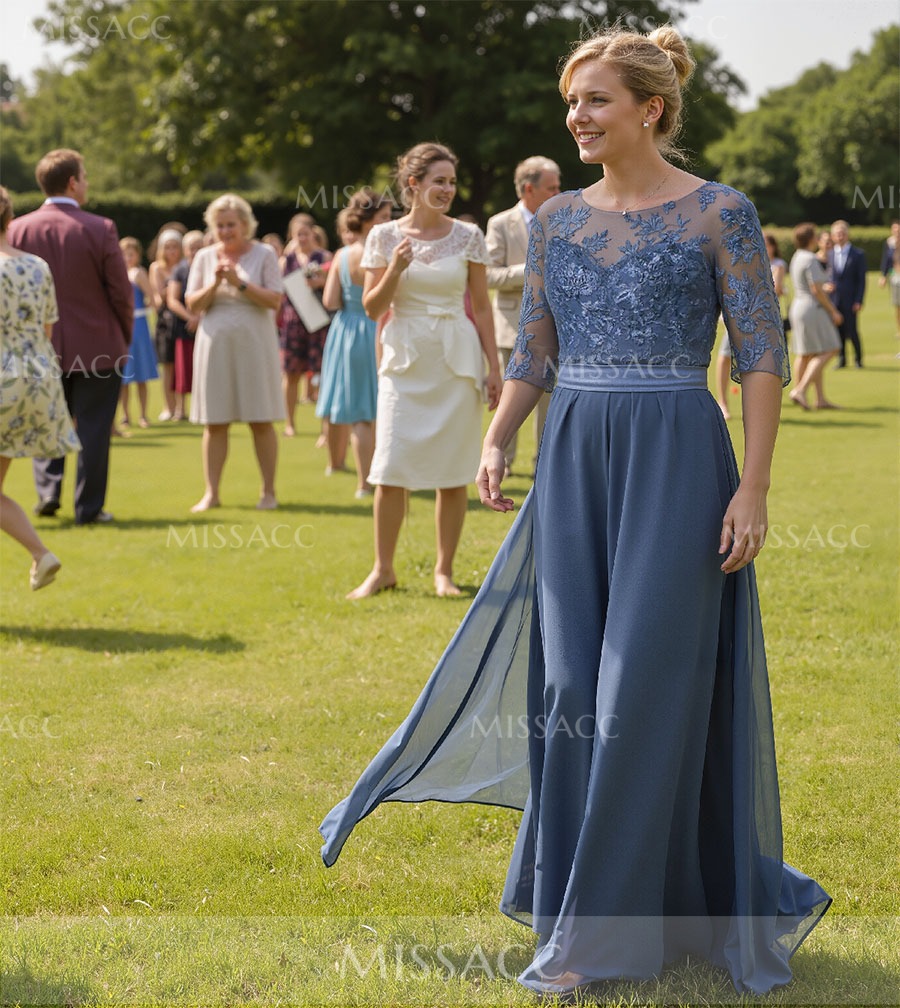 Discover our A-line Chiffon Mother of the Bride Dress, adorned with lace appliques for a timeless, sophisticated look perfect for weddings. Soft, flowing fabric ensures comfort and elegance.
