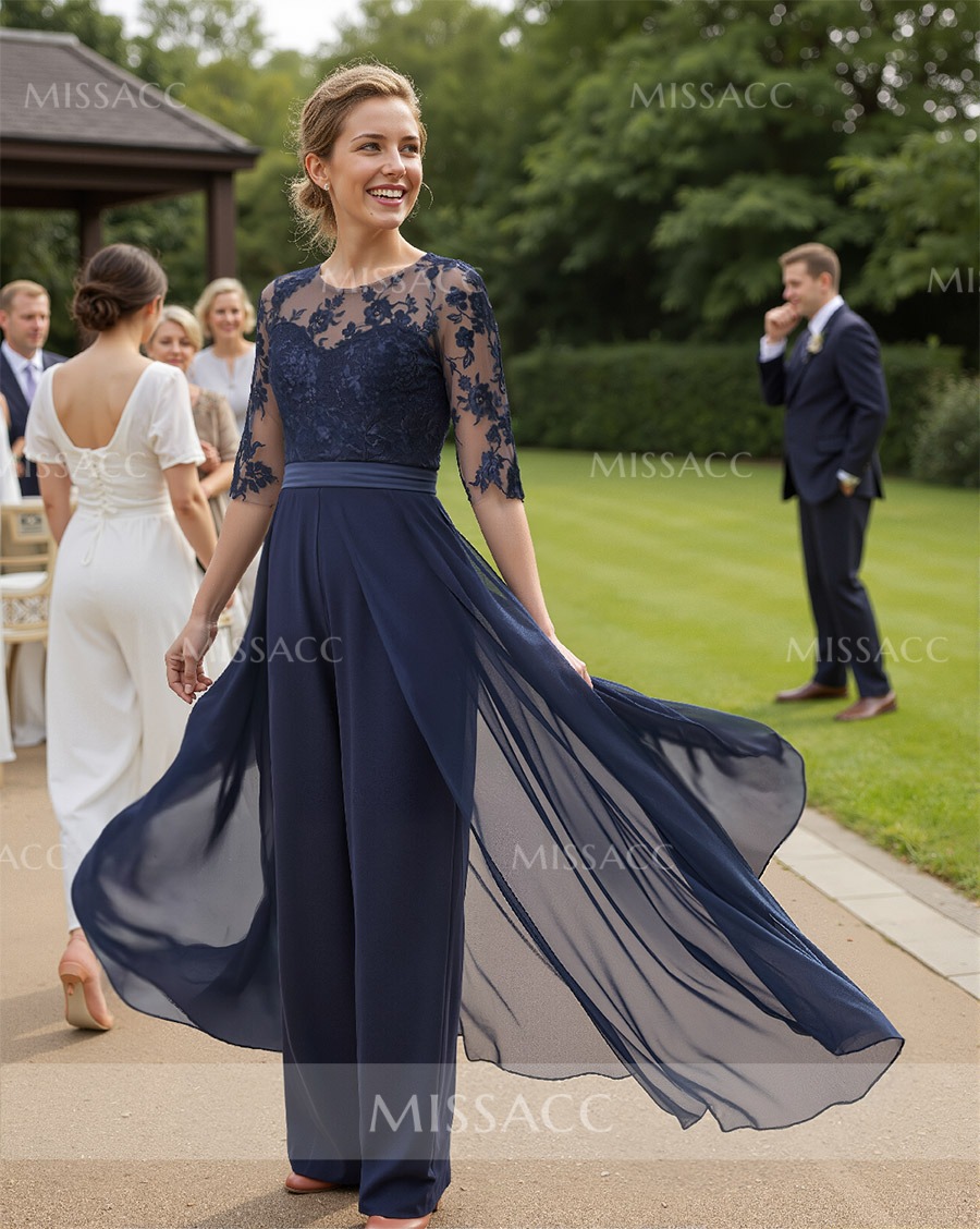 Illusion Neck Detachable Length Chiffon Mother Of The Bride Jumpsuit With Appliques Lace #SMBD11743