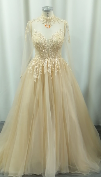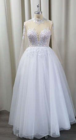 Intricate lace tulle A-line wedding dress with illusion neck and long sleeves, featuring a sweeping train for a timeless, romantic look perfect for your special day.