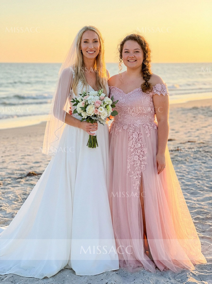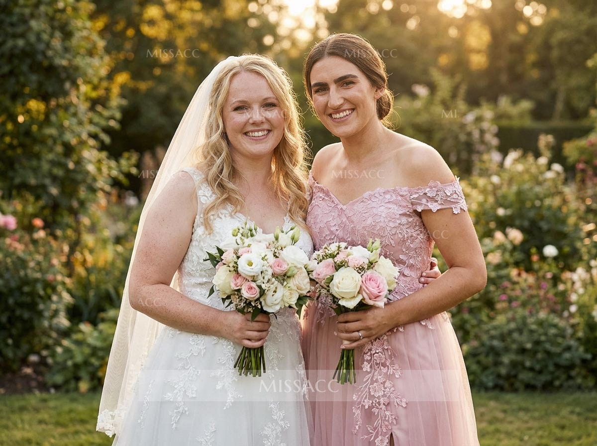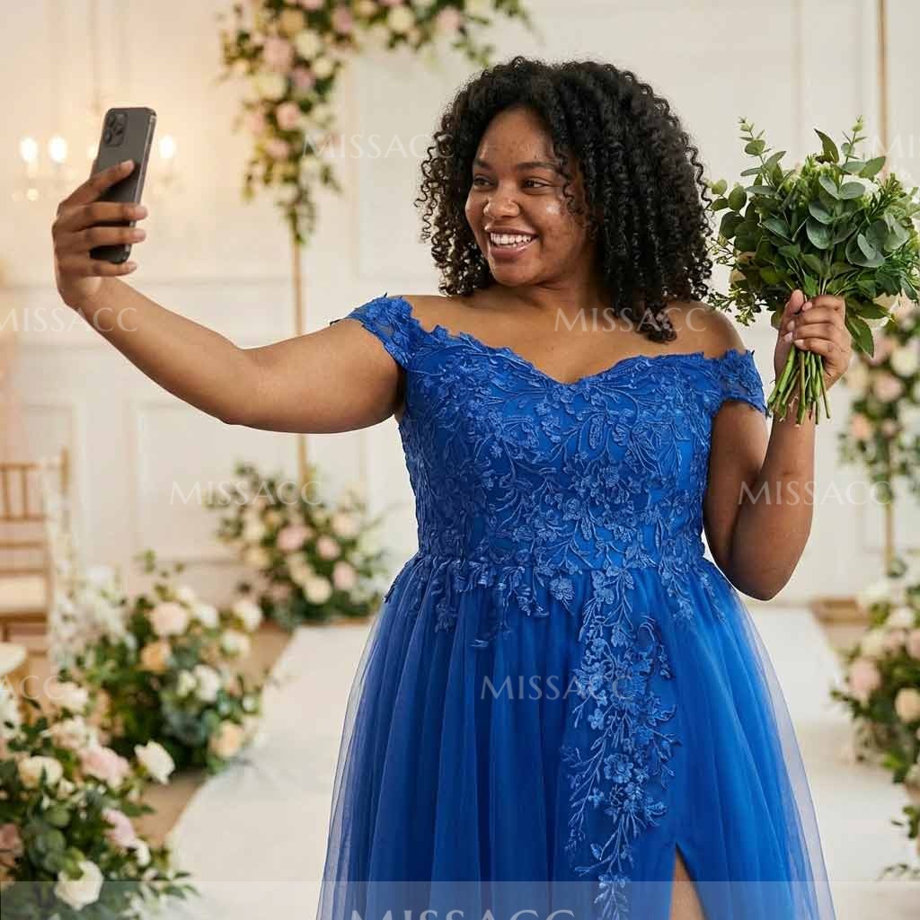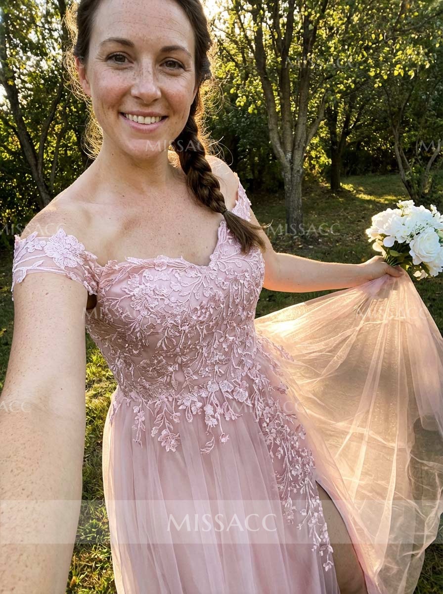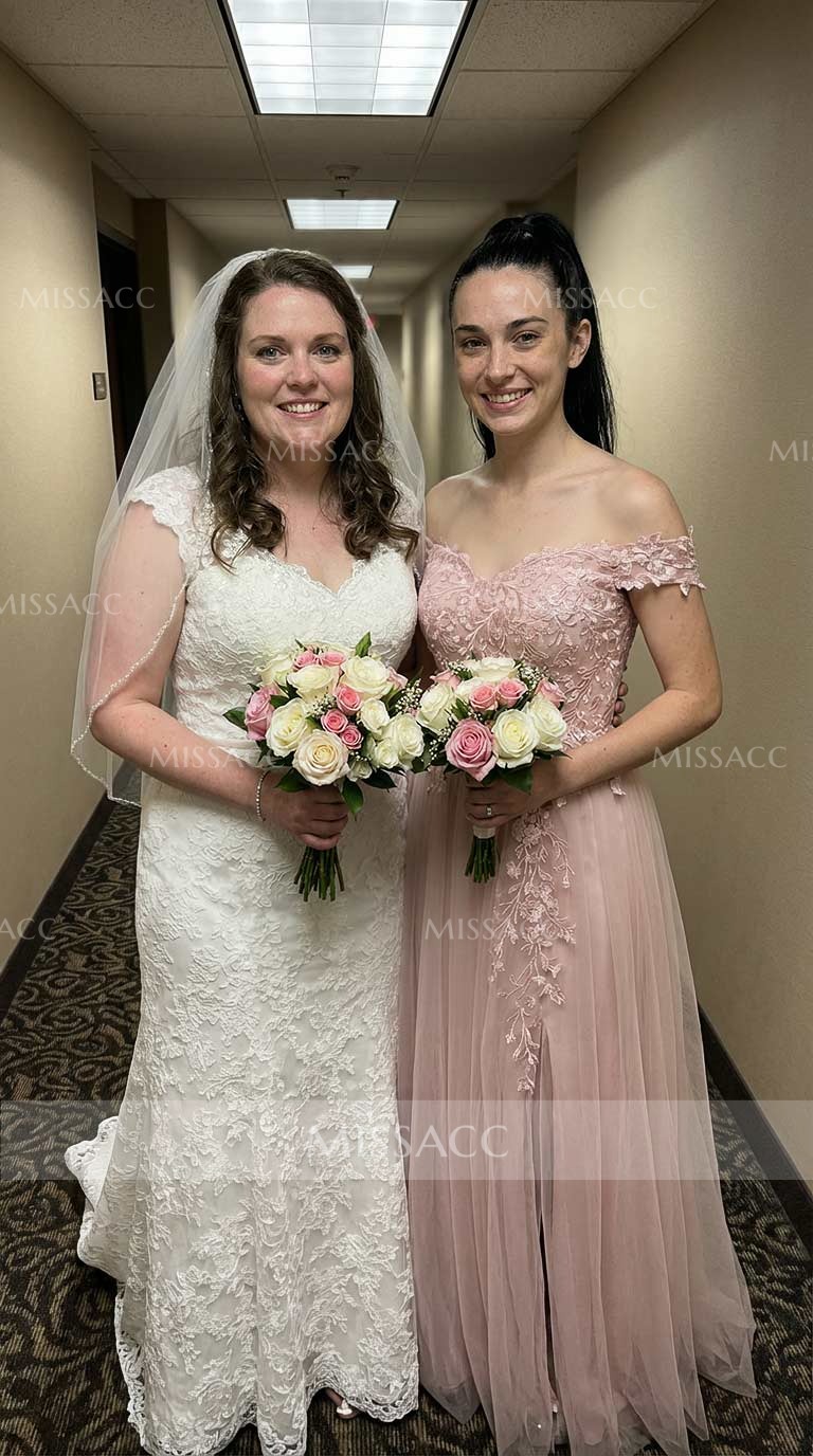 This dress is absolutely gorgeous! The off-the-shoulder style is super fashionable right now. The lace is so delicate, and the tulle is wonderfully light and airy. The front slit is a little bolder than I expected, but it's a really chic detail. It's a bit of an investment, but it's a fantastic choice for any special event.