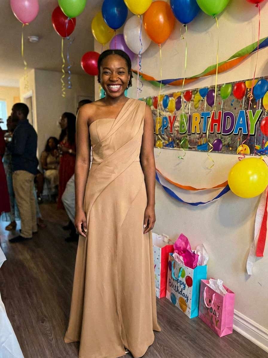 Just got my dress today and wow, I'm impressed! The fit is perfect and the length is just right. The one-shoulder design adds a unique touch to it. I can't wait to wear it to prom!