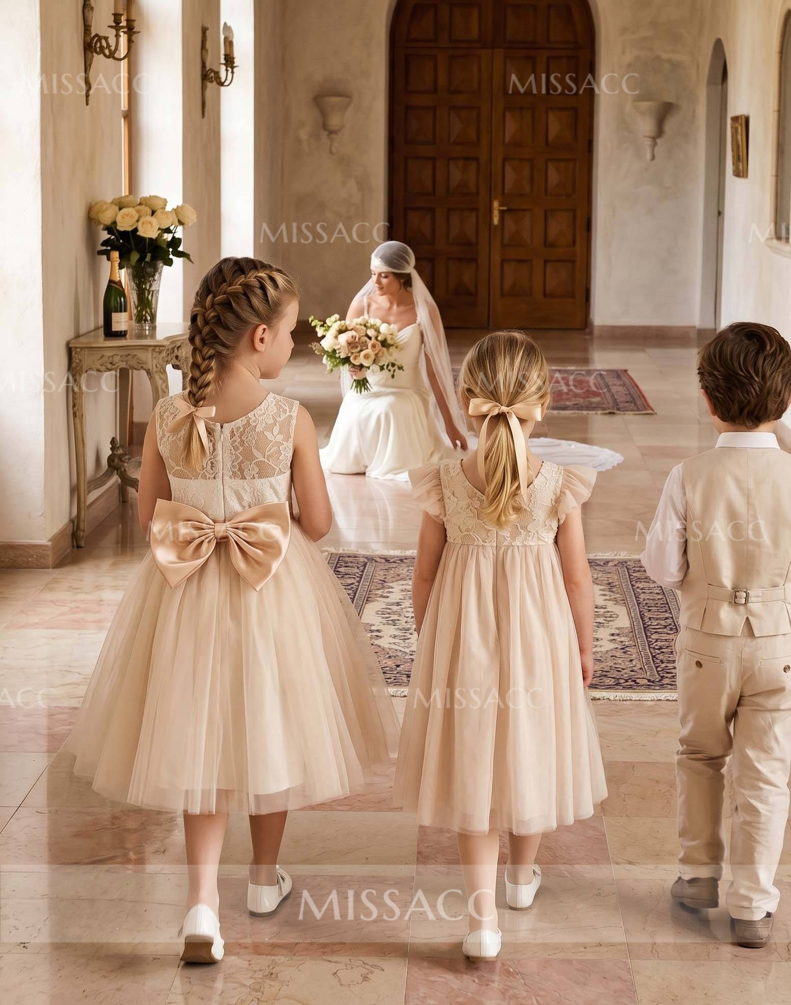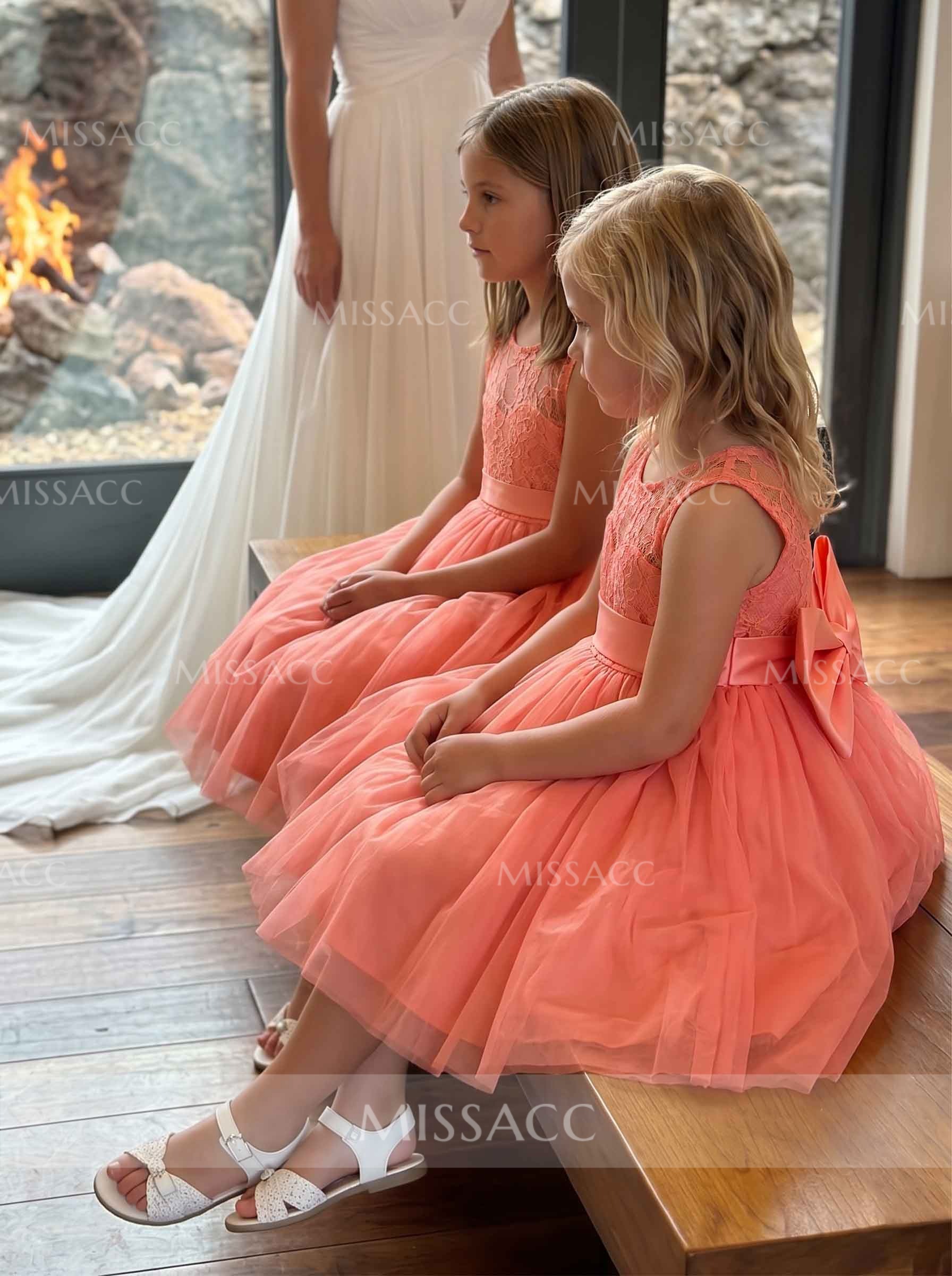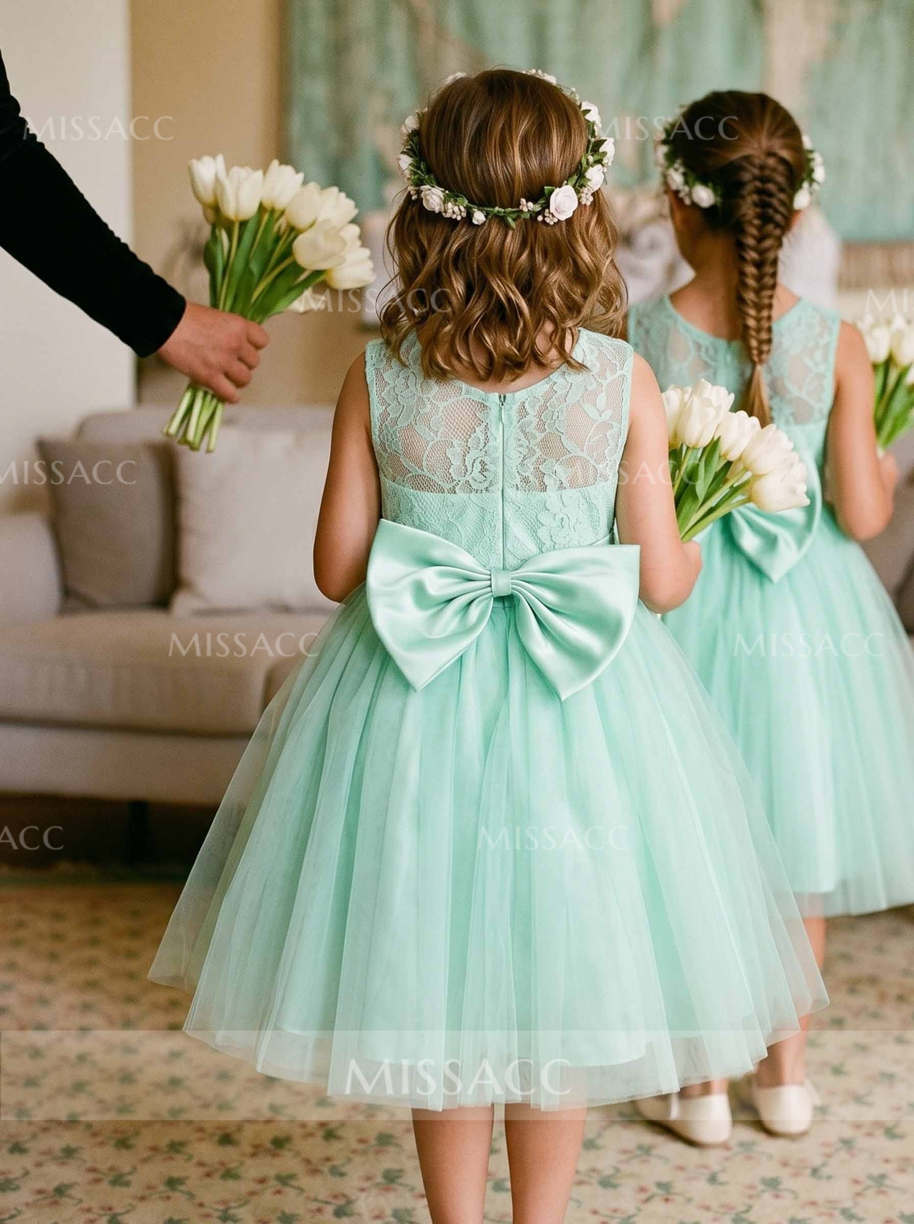 A-line Princess Scoop Neck Knee-Length Lace Tulle Flower Girl Dress with Bowknot Sashes, perfect for weddings and special events.