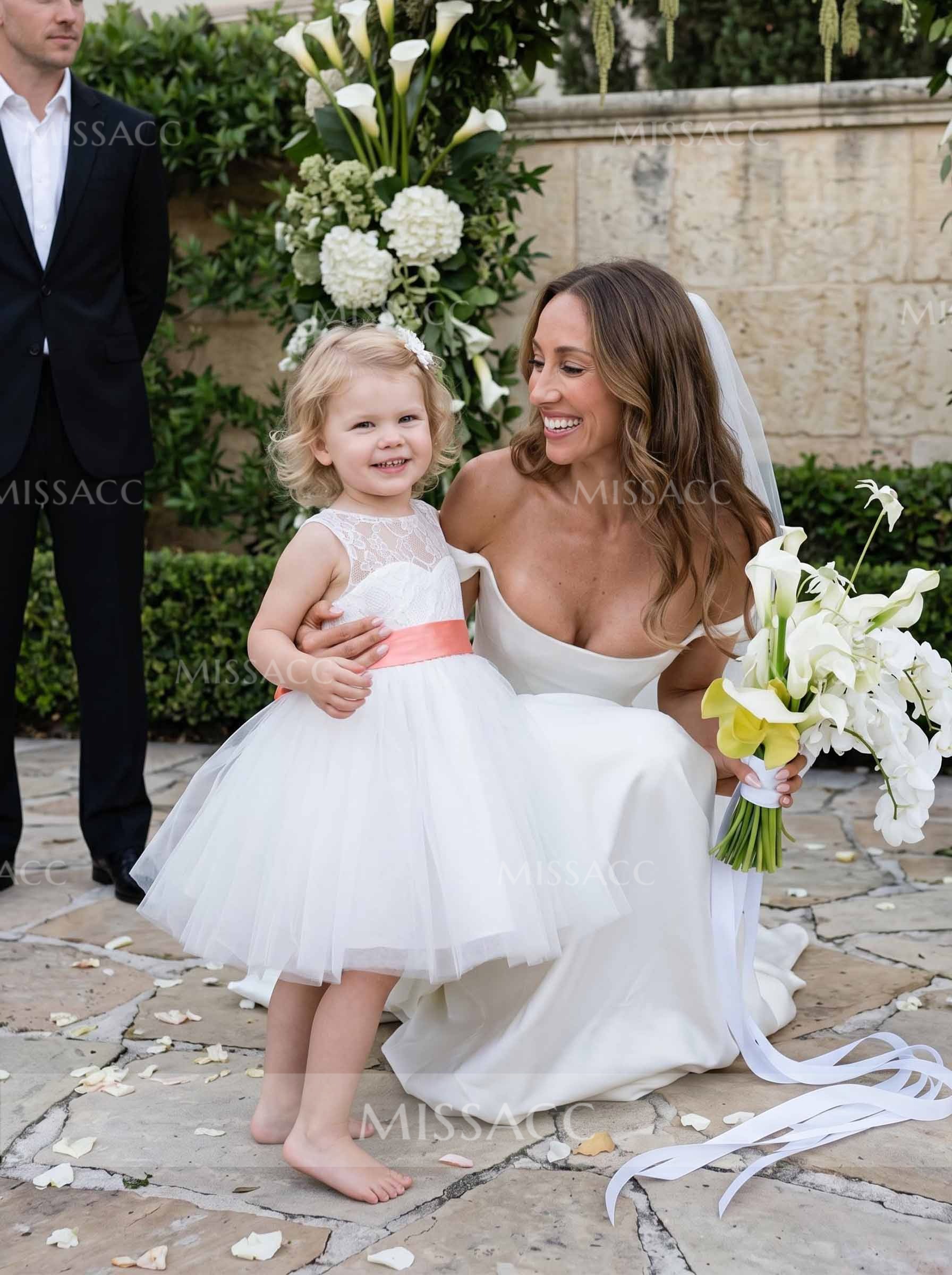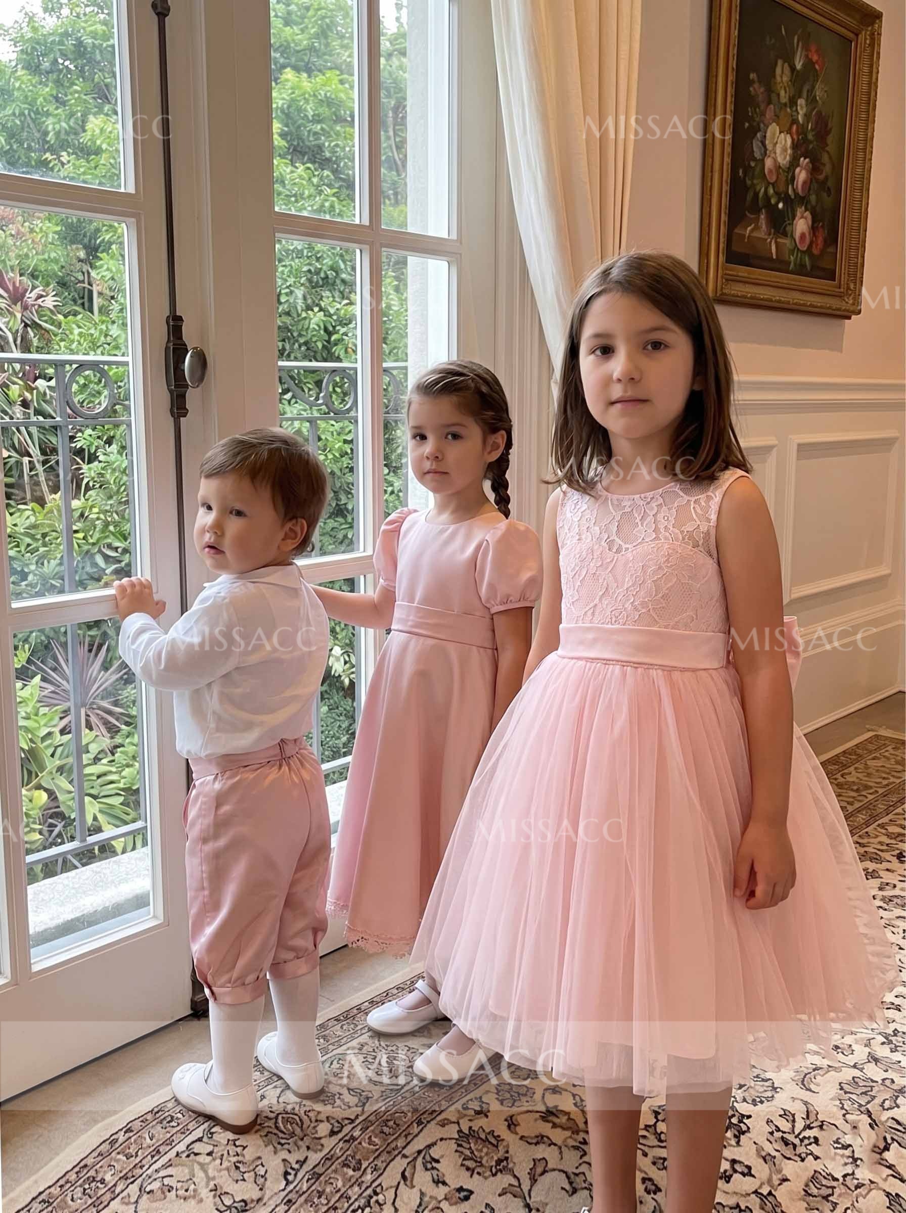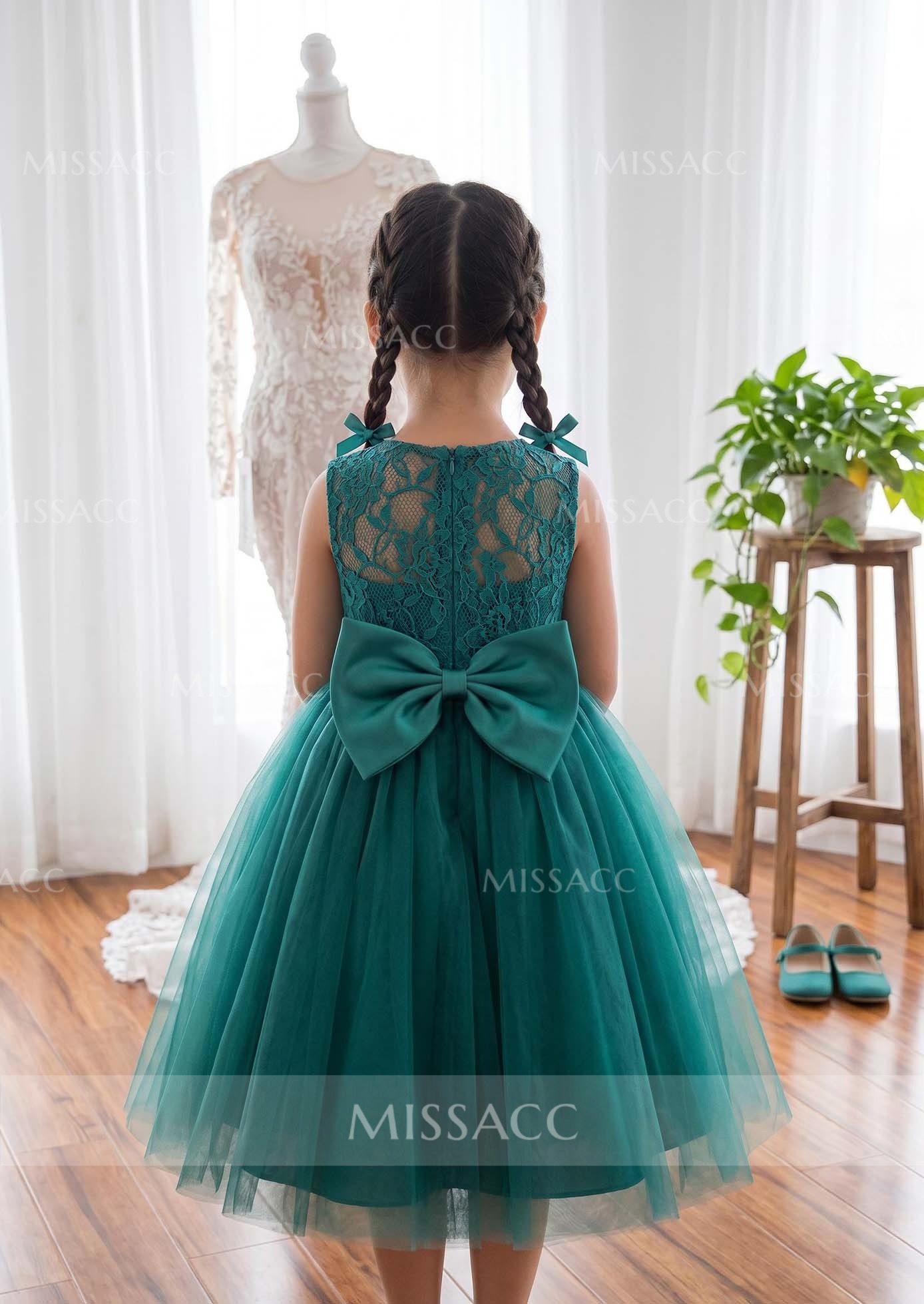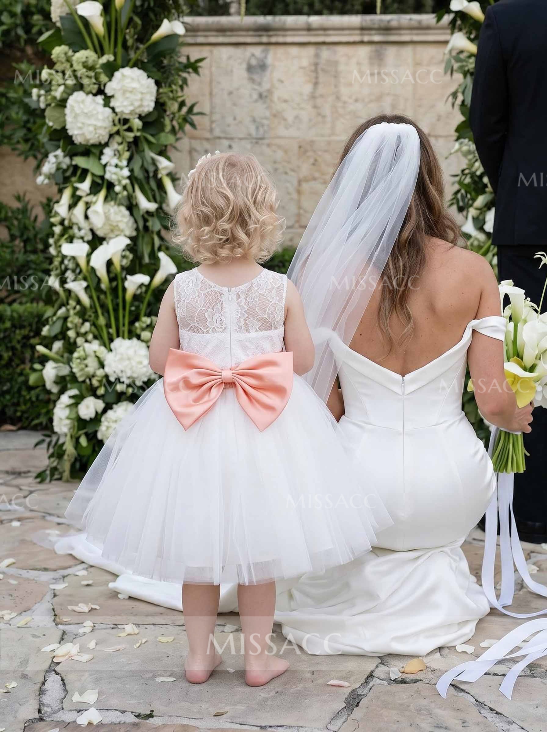 A-line Princess Scoop Neck Knee-Length Lace Tulle Flower Girl Dress with Bowknot Sashes, perfect for weddings and special events.