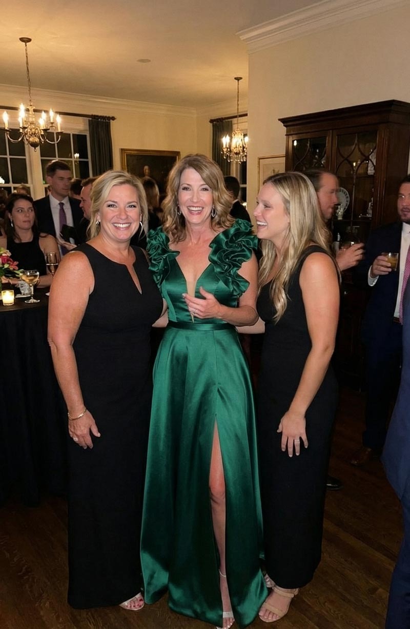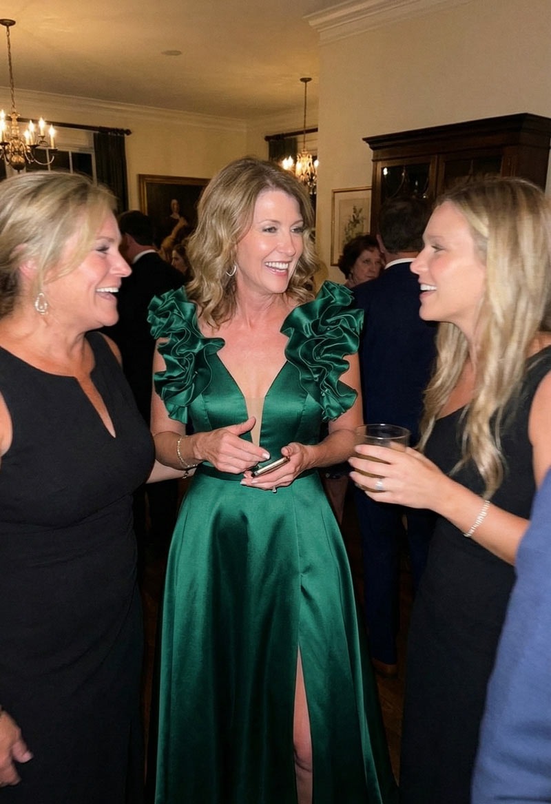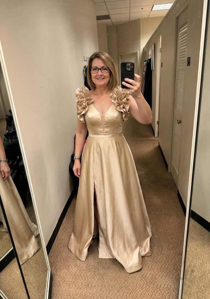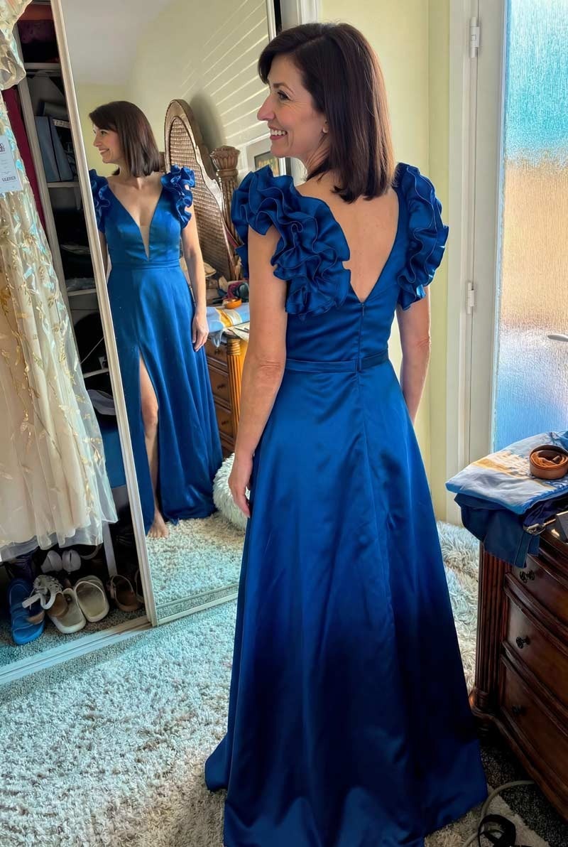 I ordered this dress for my son's wedding next month and honestly, I was nervous about buying online. The satin feels way heavier and nicer than I expected for the price. The ruffles on the side actually hide my tummy area perfectly, which was my main concern. It’s a little long since I’m only 5’3”, so I’ll need to get it hemmed, but otherwise, the fit is great. I got the navy blue and the color is deep and rich. Really happy with how elegant it looks without trying too hard.