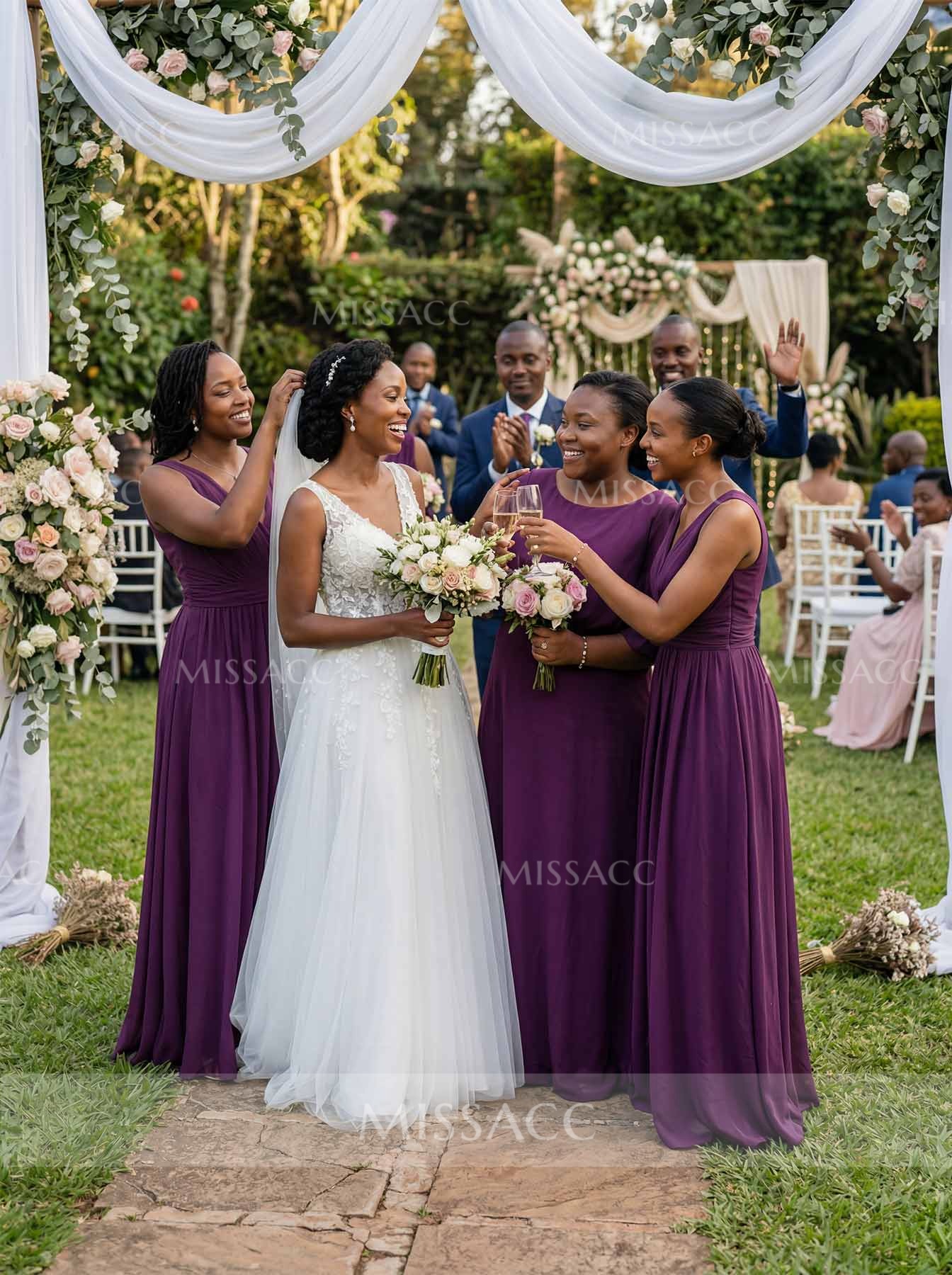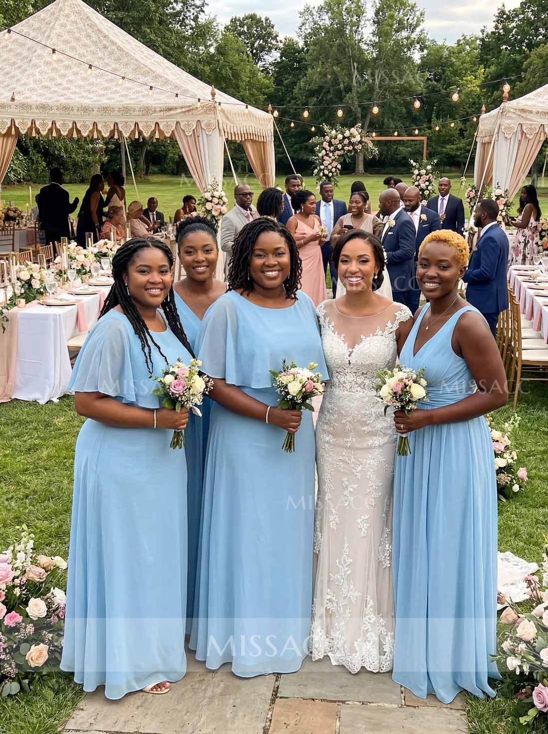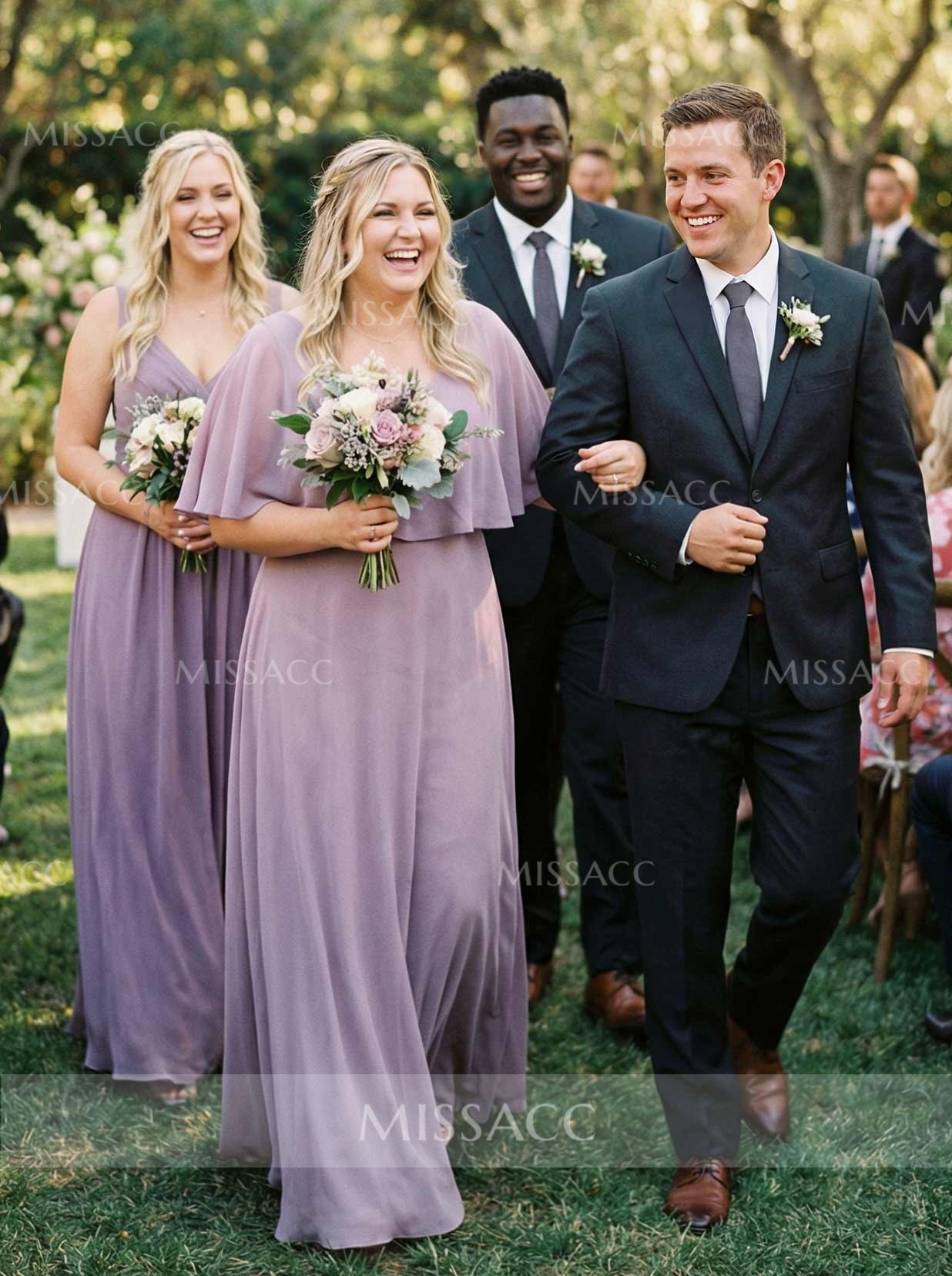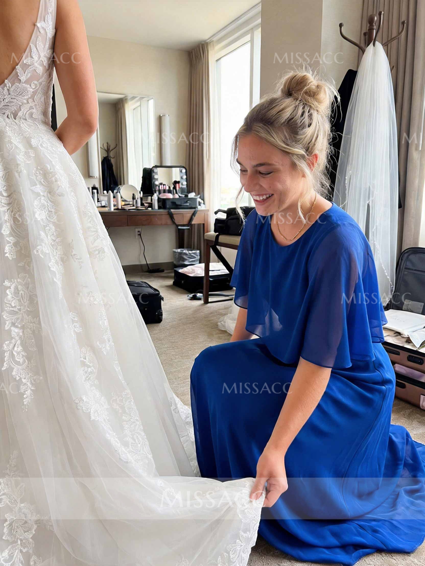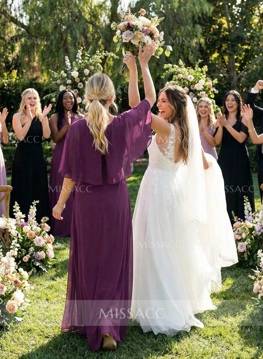 Discover our A-line Chiffon Bridesmaid Dresses, featuring a scoop neck and 1/2 sleeves for a floor-length, graceful look perfect for weddings and formal events.