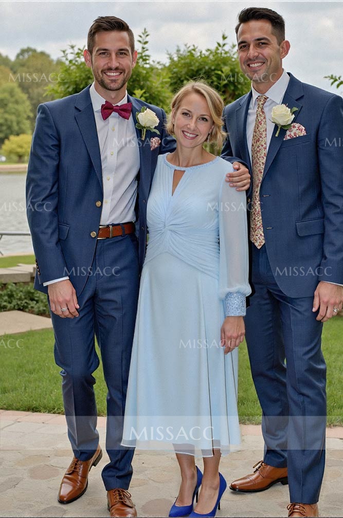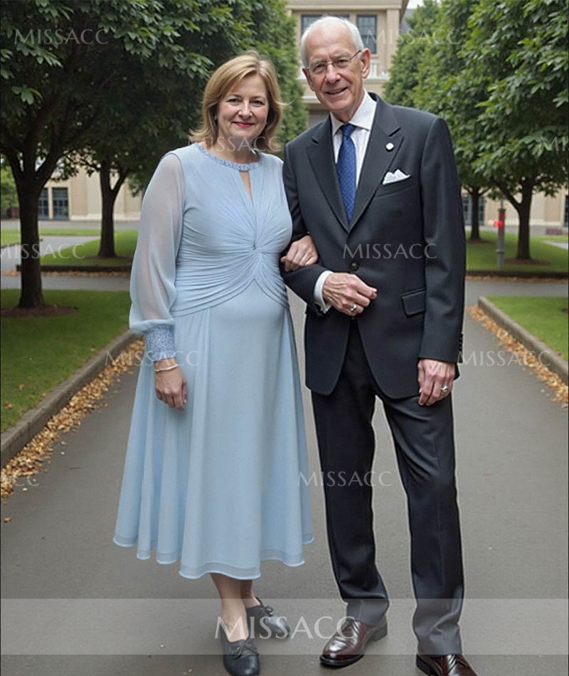Elegant A-line Chiffon Mother of the Bride Dress with Beading, perfect for special occasions. Graceful scoop neck, long sleeves, and exquisite detailing.