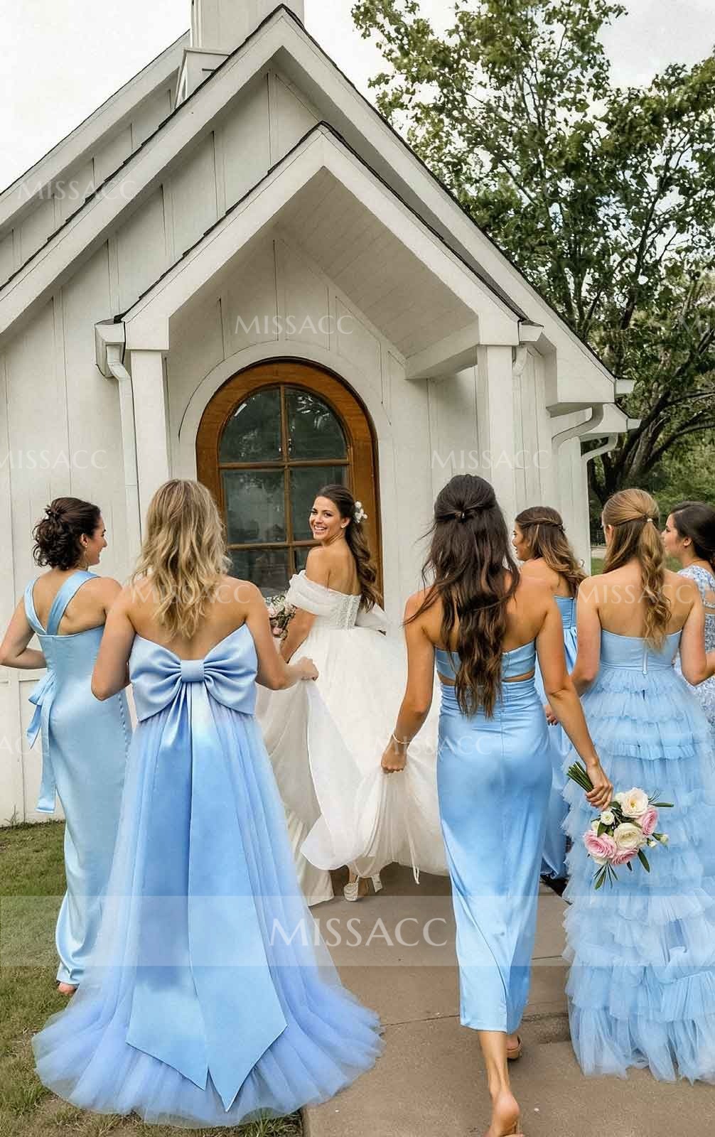 **Unveil your dream bridal party with this exquisite satin and tulle A-line bridesmaid dress.** Featuring a strapless, sleeveless design adorned with a chic bow, this gown boasts a captivating sweep train for a graceful silhouette. Perfect for weddings and formal events. **Classy A-line Bridesmaid Dress