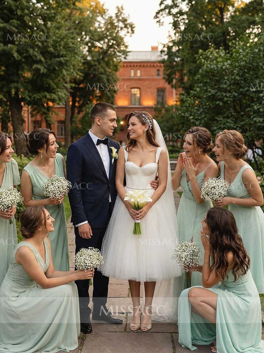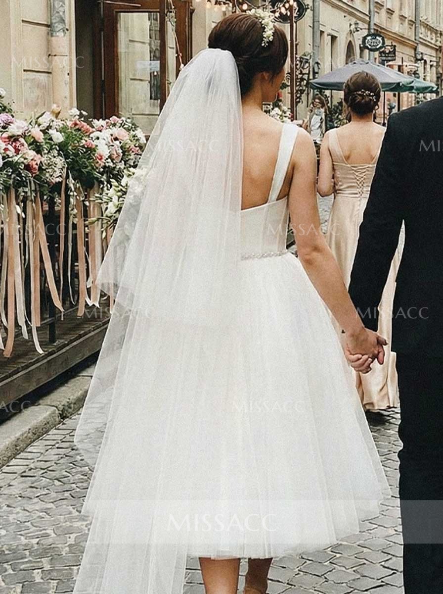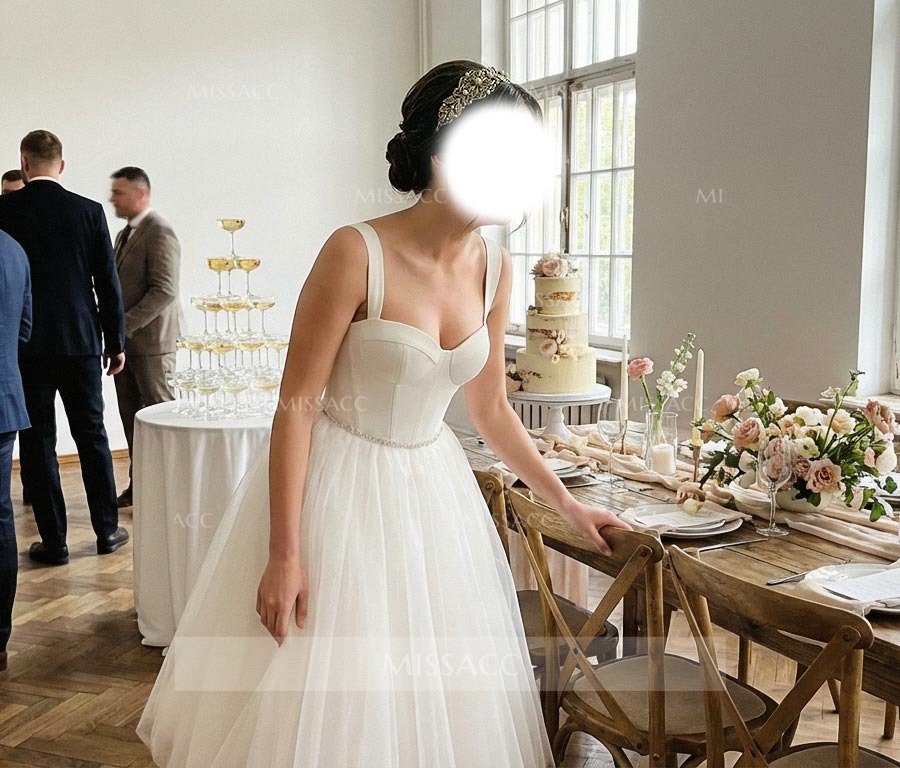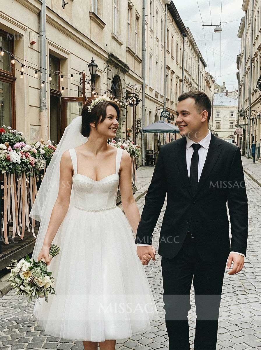 The dress is truly striking, with a sweetheart neckline and a regular straps style. Your contours are shaped and accentuated by the boning detail of the corset bodice.The skirt creates an A-line silhouette, which is exquisitely designed with tulle that lend volume and a fun touch. This little white wedding dress will make you the center of attention.