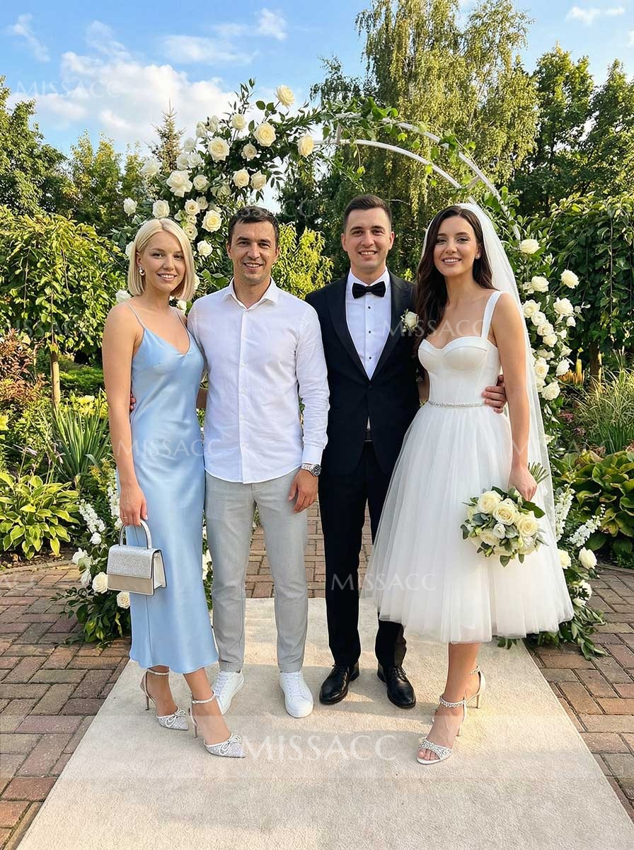 I simply adore this dress! The heart-shaped neckline and tulle fabric make it full of romantic charm. The knee-length is just right, being both elegant and comfortable. The beaded details add a touch of refinement. It's a very unique wedding dress.