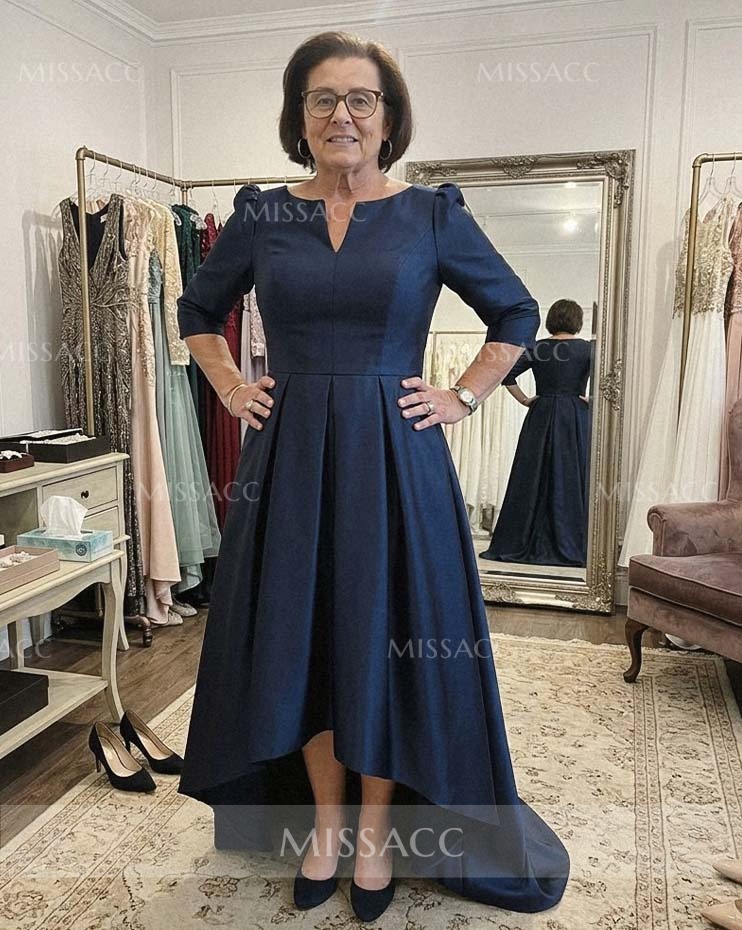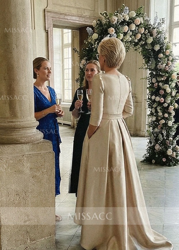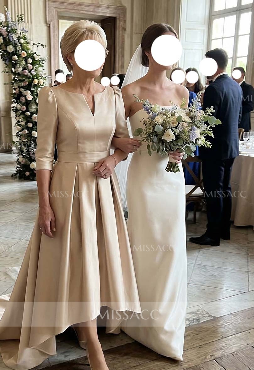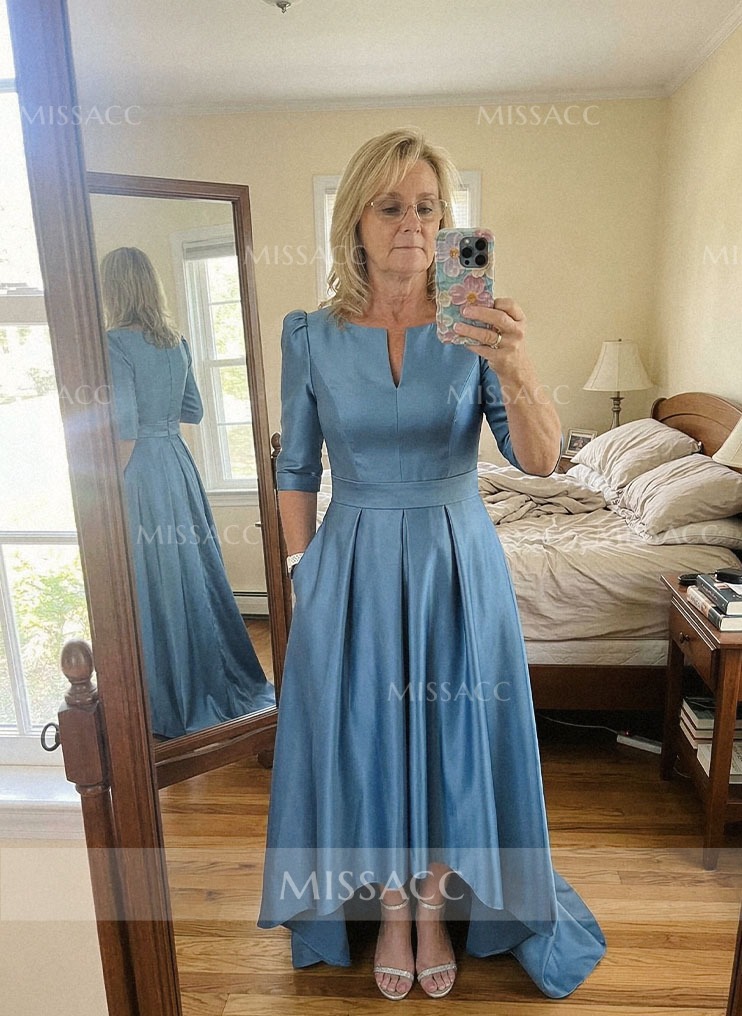Discover a chic satin mother-of-the-bride dress with a flattering A-line silhouette and V-neck design. Perfect for a sophisticated wedding event, this dress features a graceful sweep train and half sleeves.