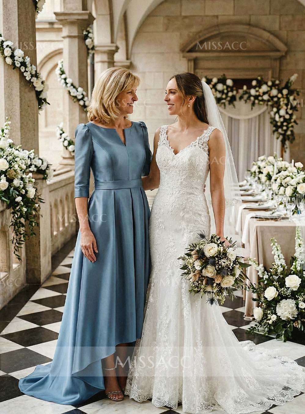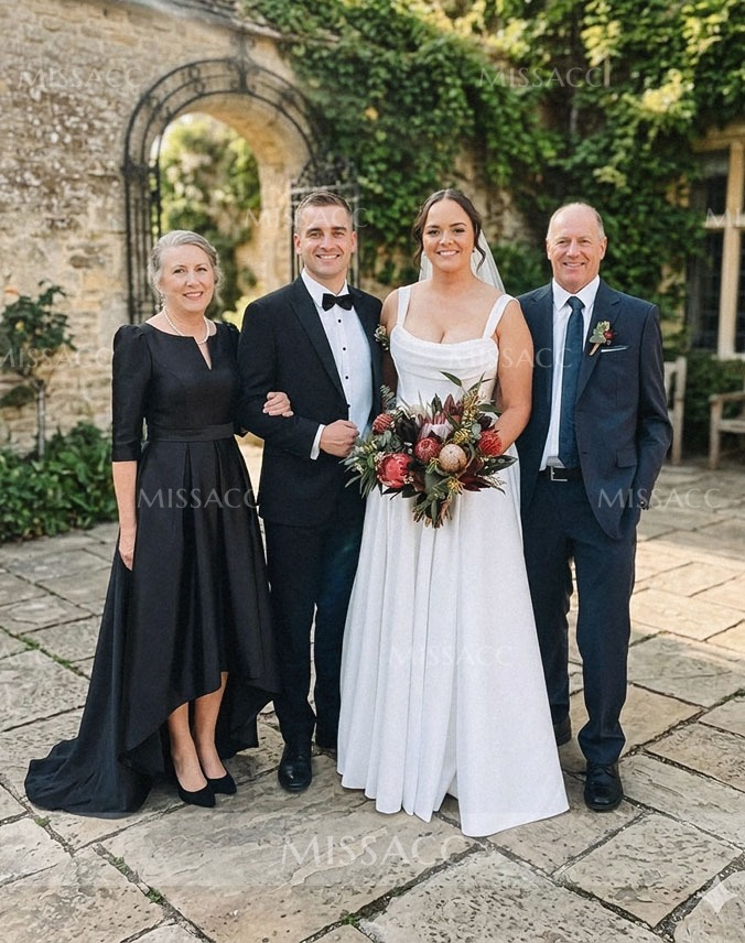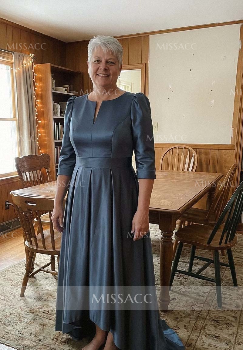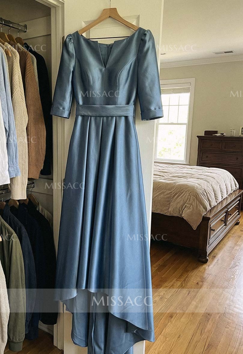 Discover a chic satin mother-of-the-bride dress with a flattering A-line silhouette and V-neck design. Perfect for a sophisticated wedding event, this dress features a graceful sweep train and half sleeves.
