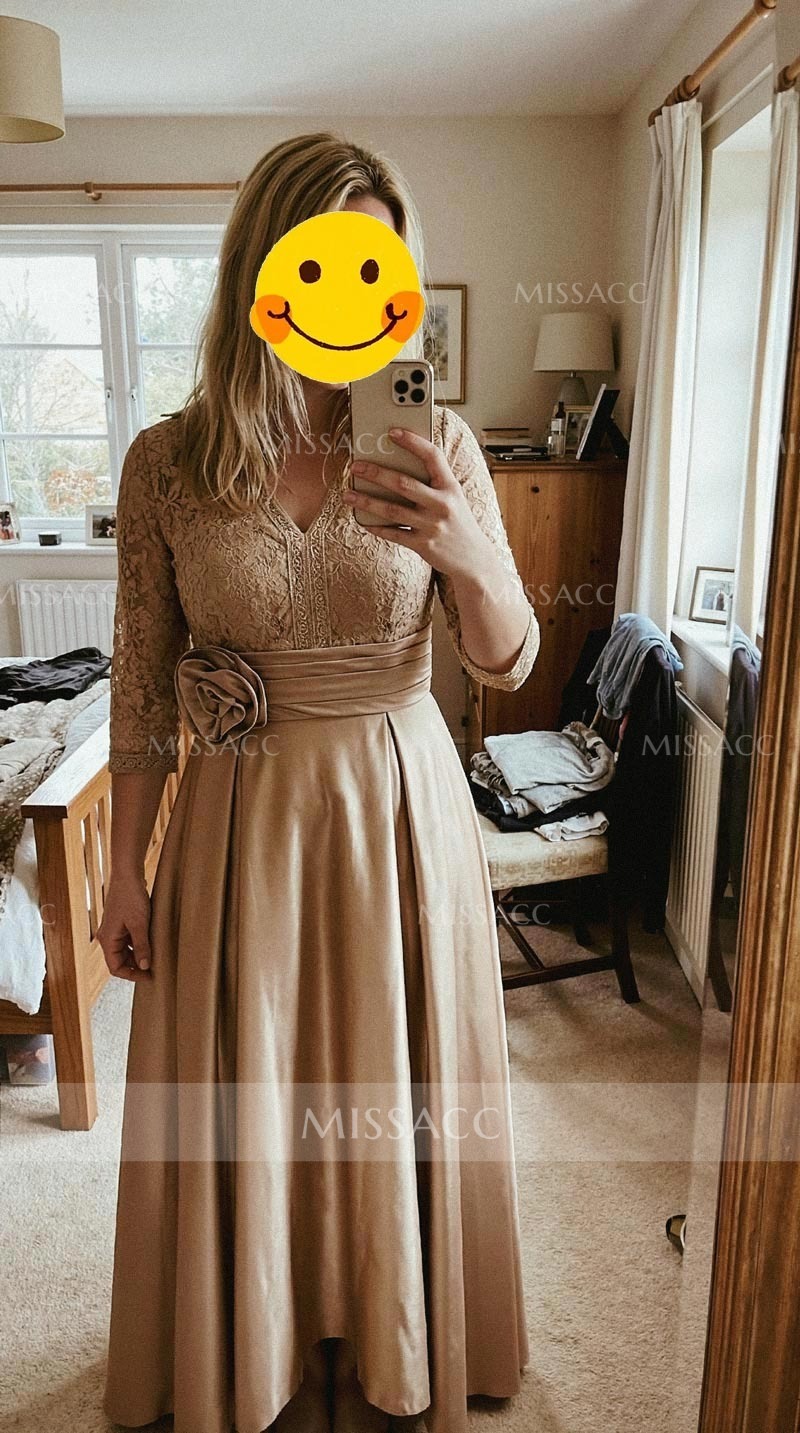 Discover our refined Mother of the Bride Dresses, featuring a flattering A-line silhouette and V-neck design. Crafted from luxurious satin and lace with delicate flower details and 3/4 sleeves, this floor-length gown offers sophisticated comfort for weddings and formal evening galas.