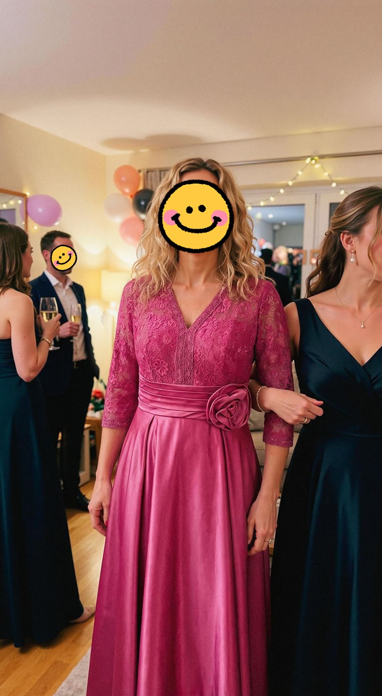 I honestly wasn't sure what to expect ordering a dress online for my daughter's wedding, but this turned out surprisingly well. The satin feels nice and heavy, not cheap at all, and the lace sleeves give just enough coverage for my arms without making me feel overly covered up. I did have to get the hem taken up a bit since I'm on the shorter side, but that's pretty standard for me. It looked elegant in photos and I was comfortable dancing all night. Definitely a solid choice if you're on a budget but want to look good.