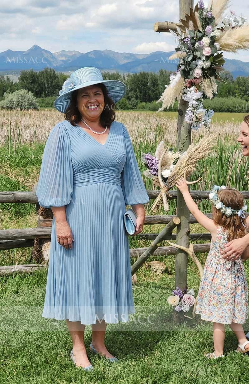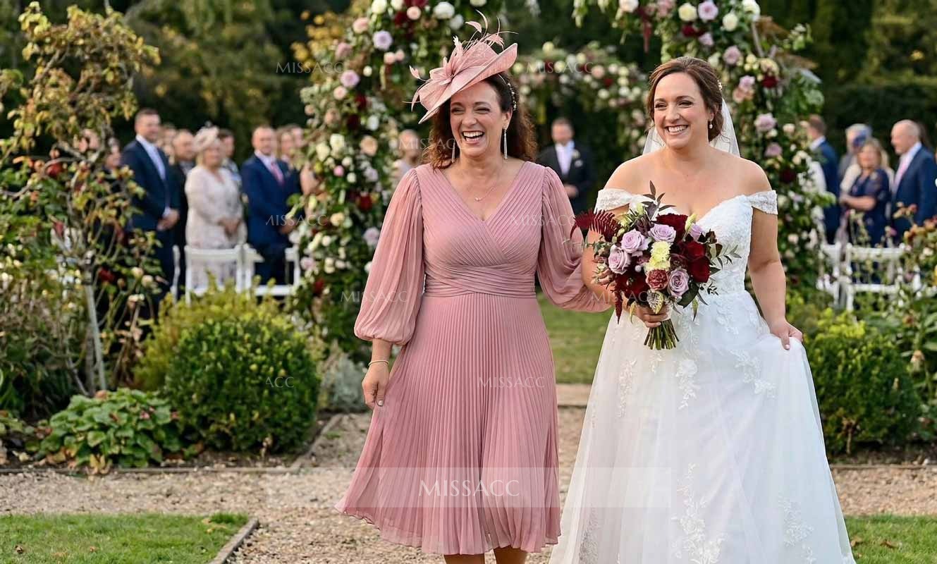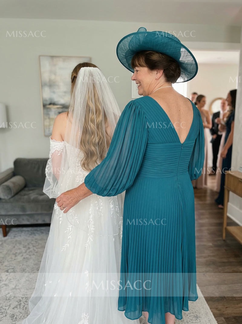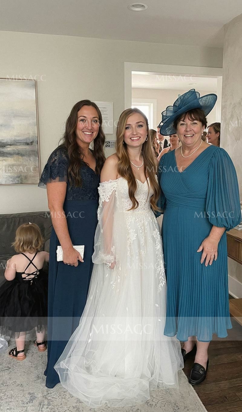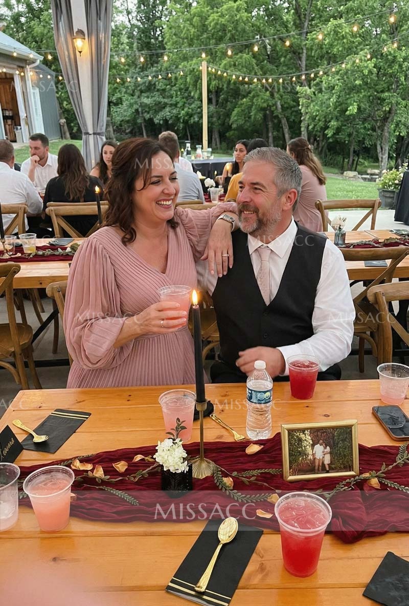 Wore this beautiful dress to my son's wedding. As an older lady, I appreciate the sleeve length covering my arms while still looking modern. The pleated bodice is very forgiving. It held up wonderfully through hours of dancing and photos.