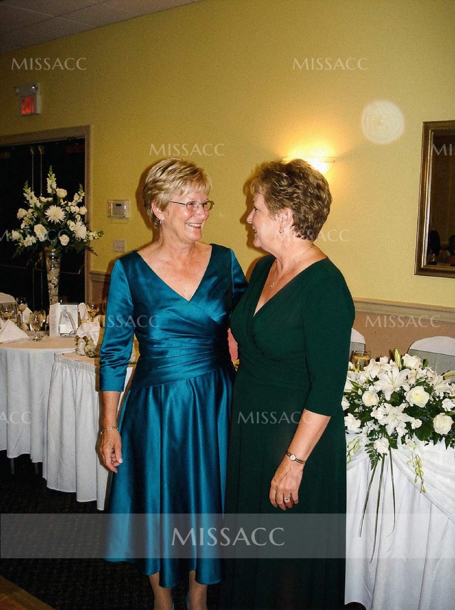 While wearing this mother of the bride dress, you will undoubtedly be described as attractive by others in the party. The dress has a v-neckline and is charmingly adorned with ruched. The bodice is framed by 3/4 sleeves. This dress features an A line shape and is tea length. Come in sporting this dress and you will catch the undivided attention of every person at the party you are attending.