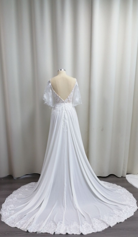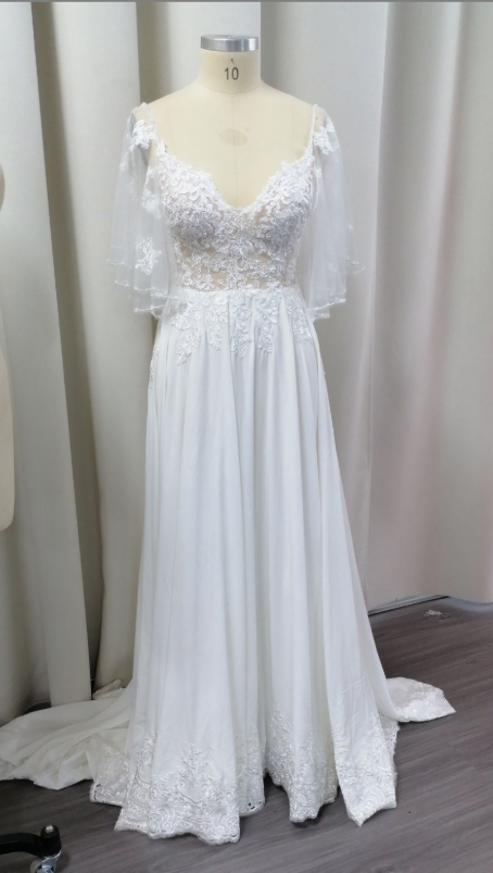 A-line V-neck lace tulle wedding dress with removable sleeves, perfect for a romantic ceremony. Timeless elegance, delicate detailing, and versatile style.