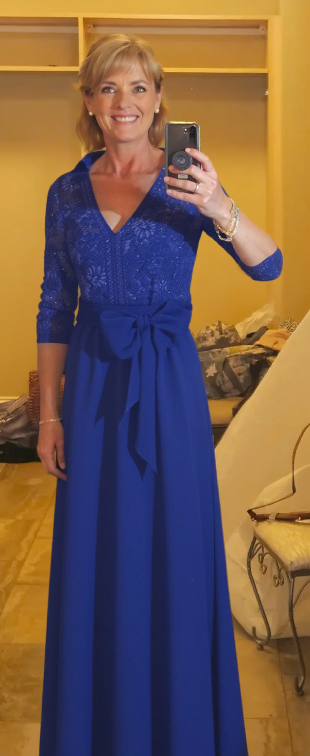 **Graceful Satin Mother of the Bride Dress with Bow & Lace ** This floor-length A-line satin gown features a flattering V-neckline and exquisite lace detailing with a charming bow accent. Perfect for weddings and formal events. Shop mother of the bride dresses and occasion wear for unforgettable style.