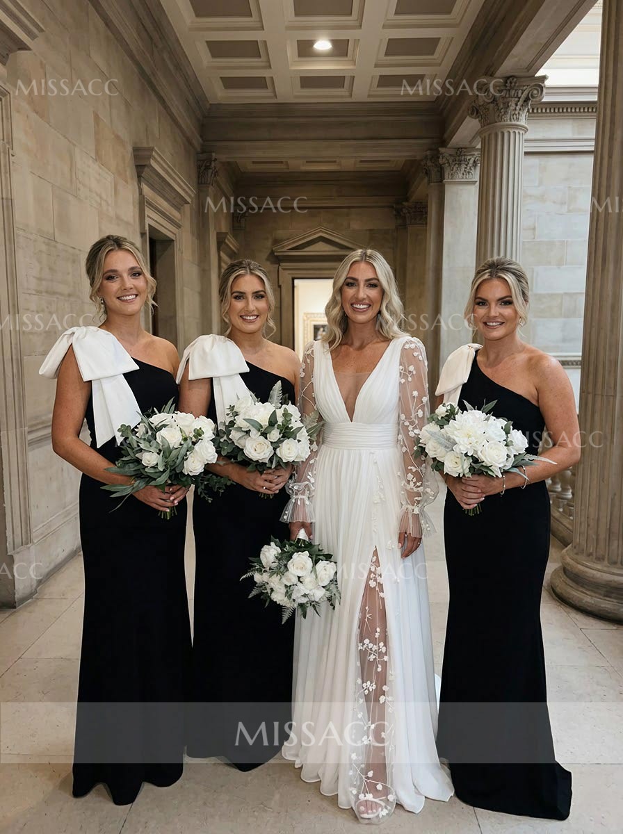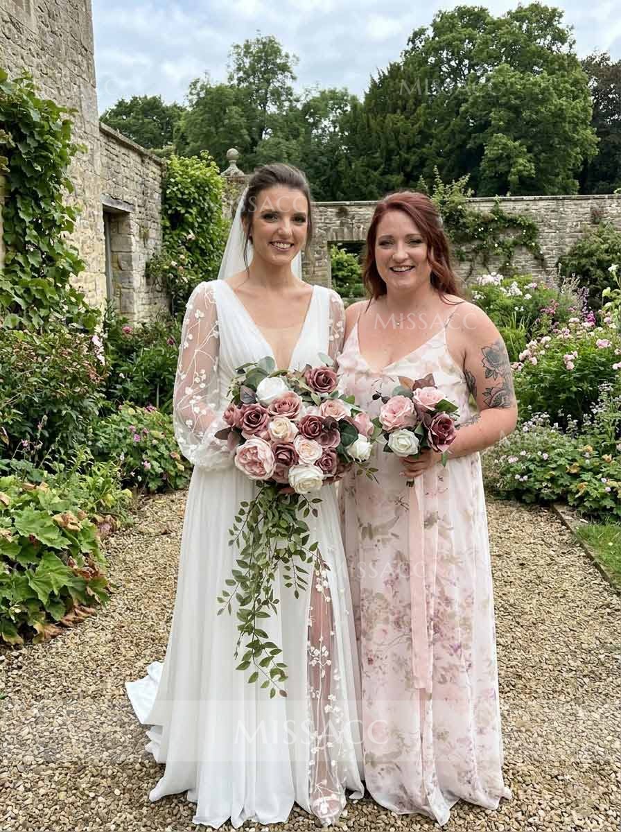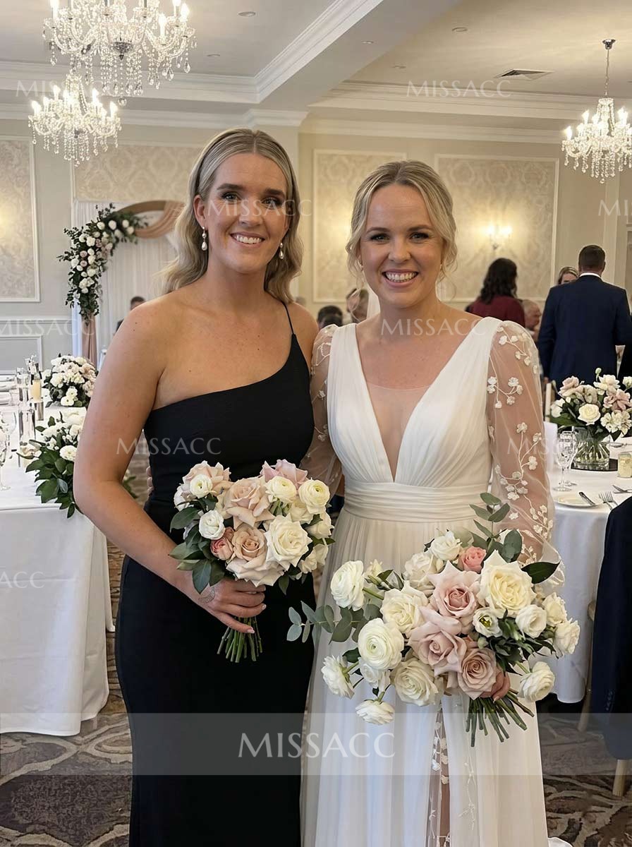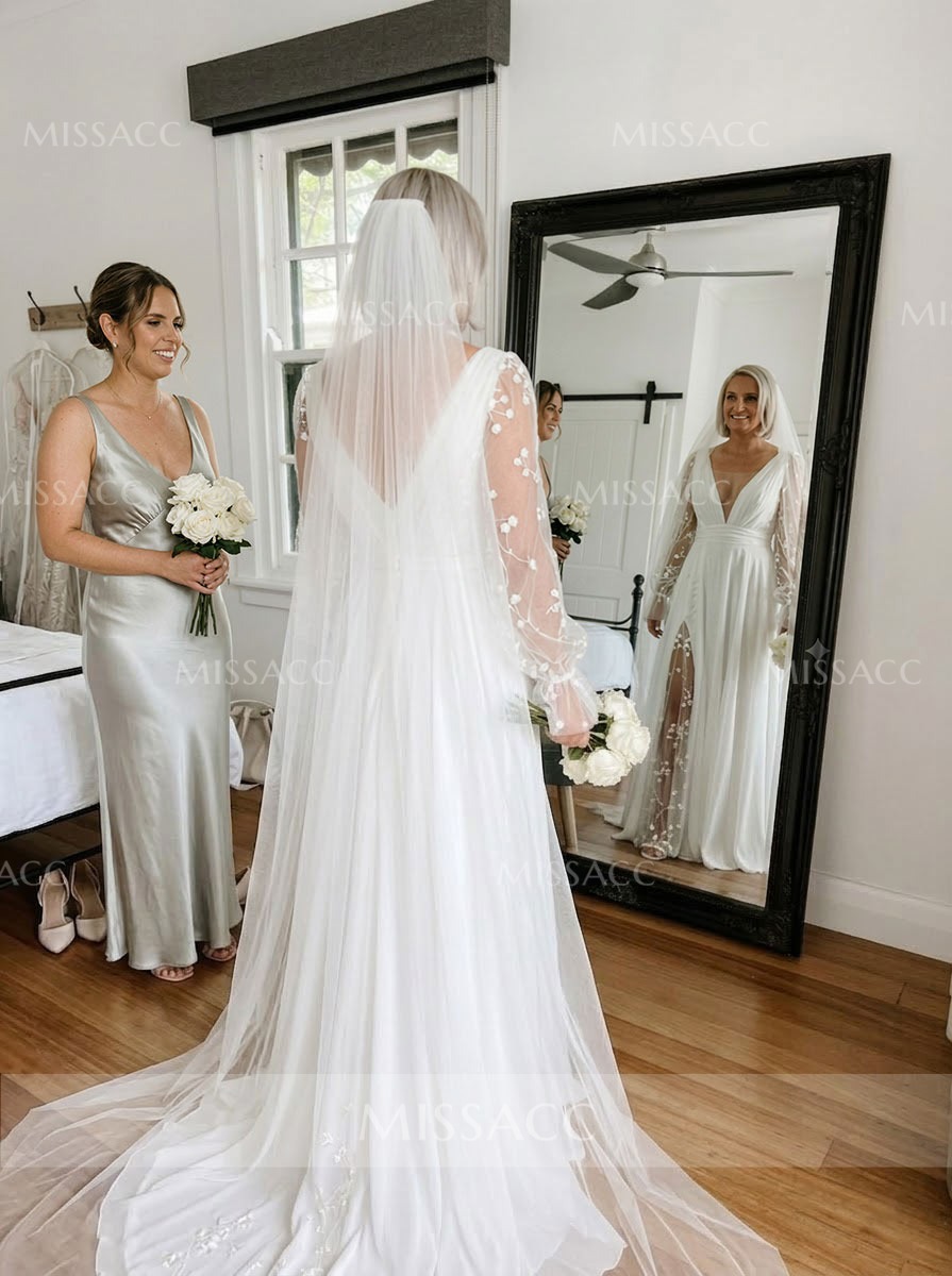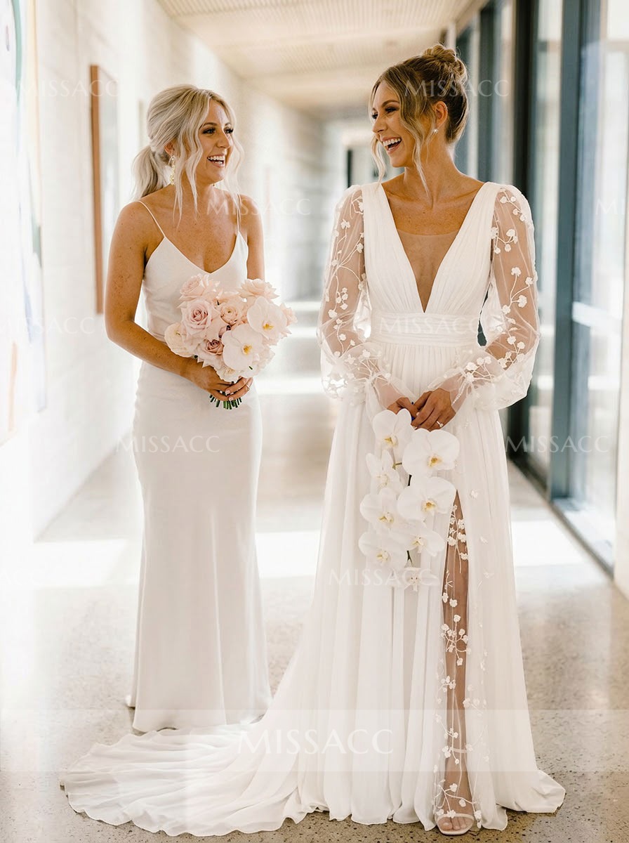 Elegant A-line wedding dress with a V-neckline, sheer lace sleeves, and a stunning lace/tulle combination. The dress features a captivating split front design, adding a touch of allure to the overall look. Perfect for brides seeking a romantic and enchanting gown.