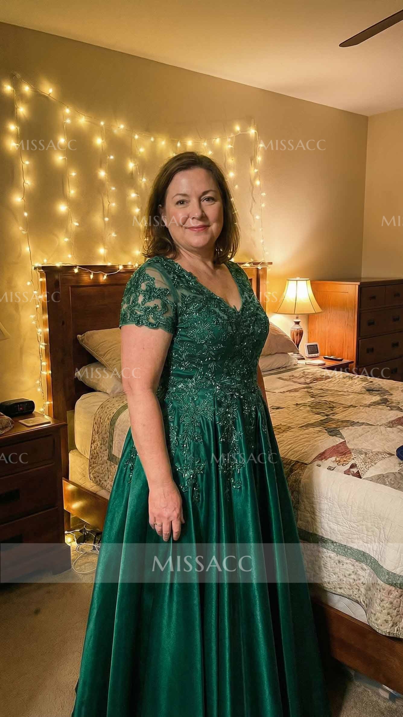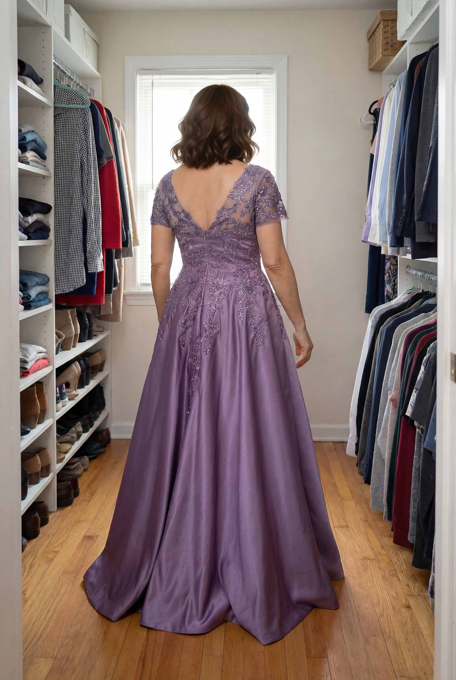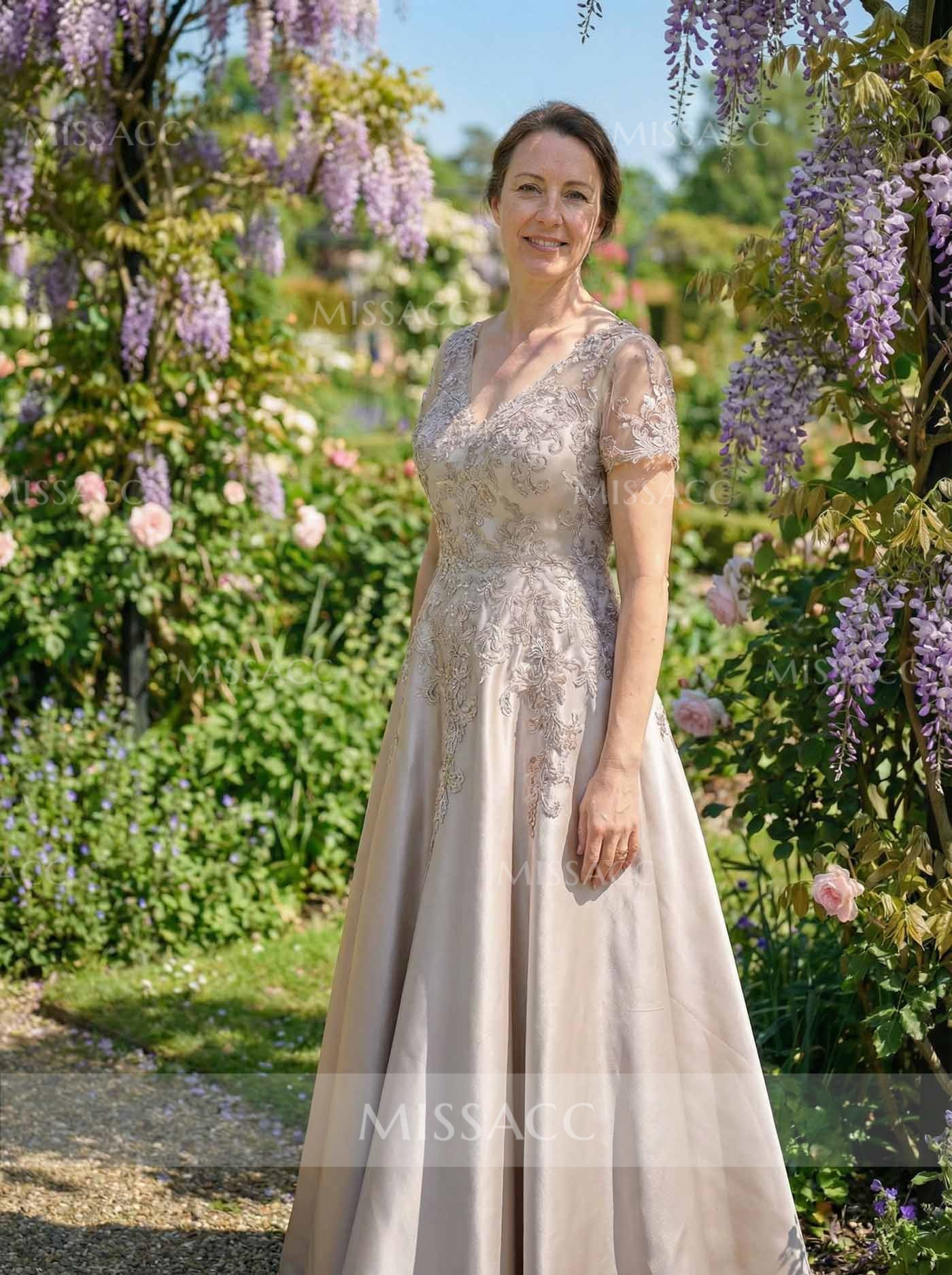 This A-line V-neck satin mother of the bride dress, featuring delicate lace detailing and short sleeves, offers a sophisticated choice for formal events. Its timeless silhouette and luxurious fabric ensure graceful style. Perfect for weddings and special celebrations. Shop elegant dresses for mothers.