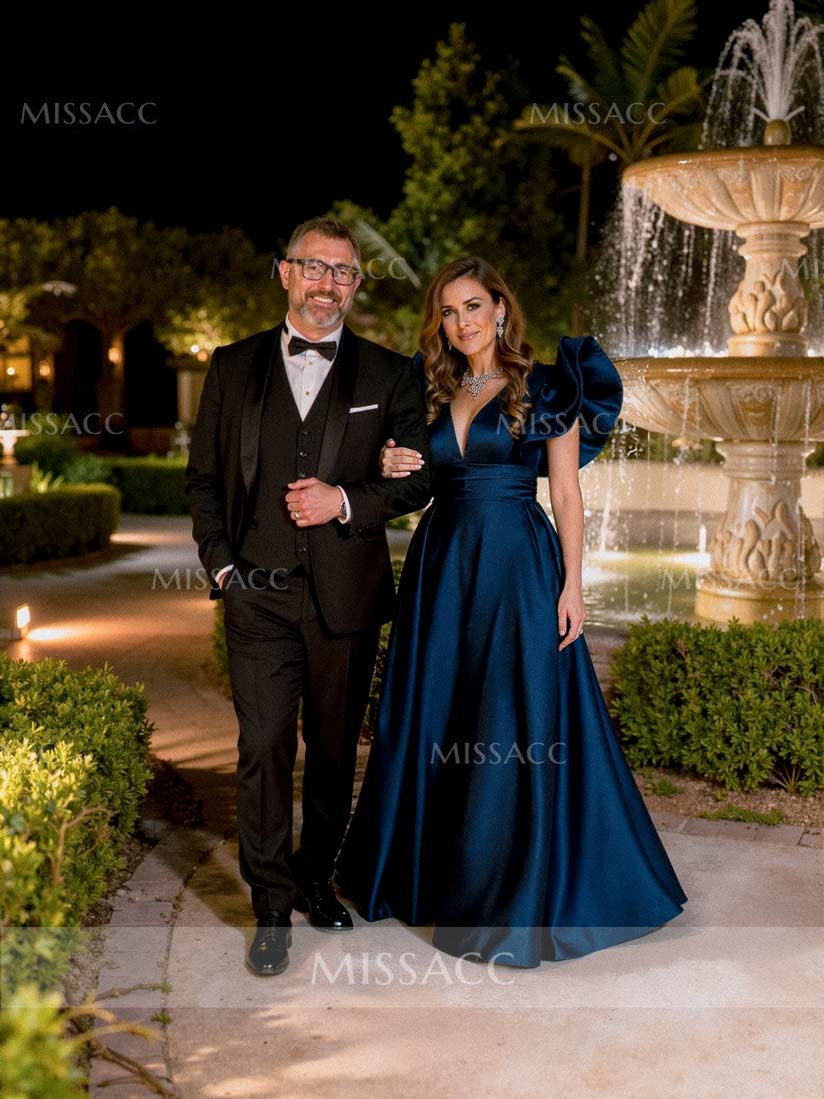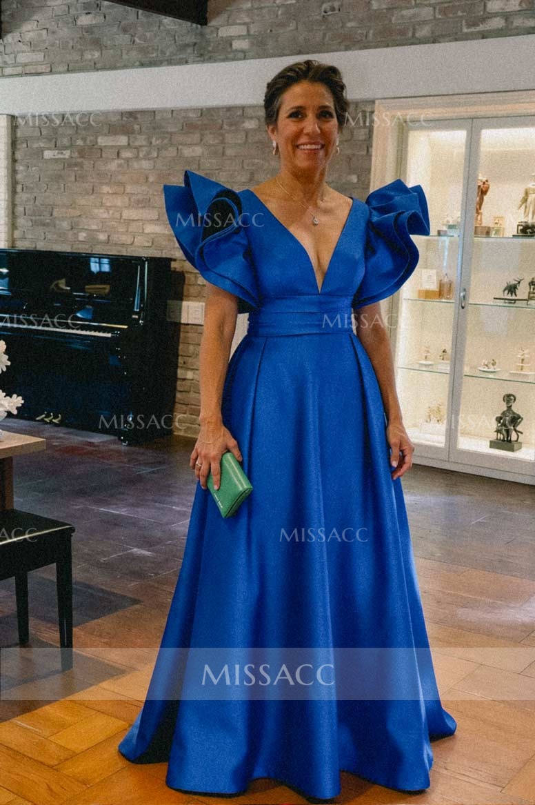 Elegant A-line V-neck Satin Mother of the Bride Dress with Ruffle. Timeless style, luxurious fabric, perfect for weddings and special events.