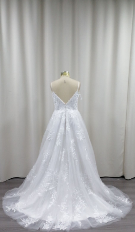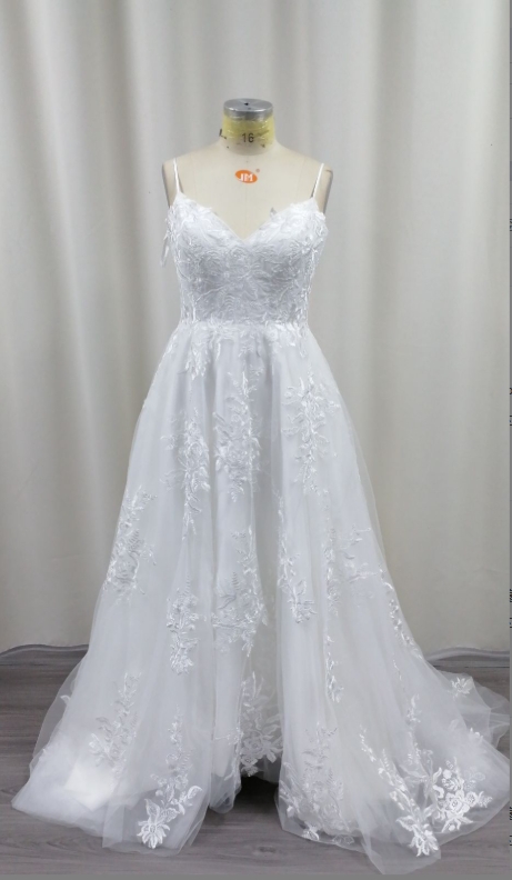 Elegant A-line V-neck Lace Tulle Wedding Dress with Sweep Train, perfect for a romantic ceremony. Luxurious fabric, intricate detailing, and a flattering silhouette.