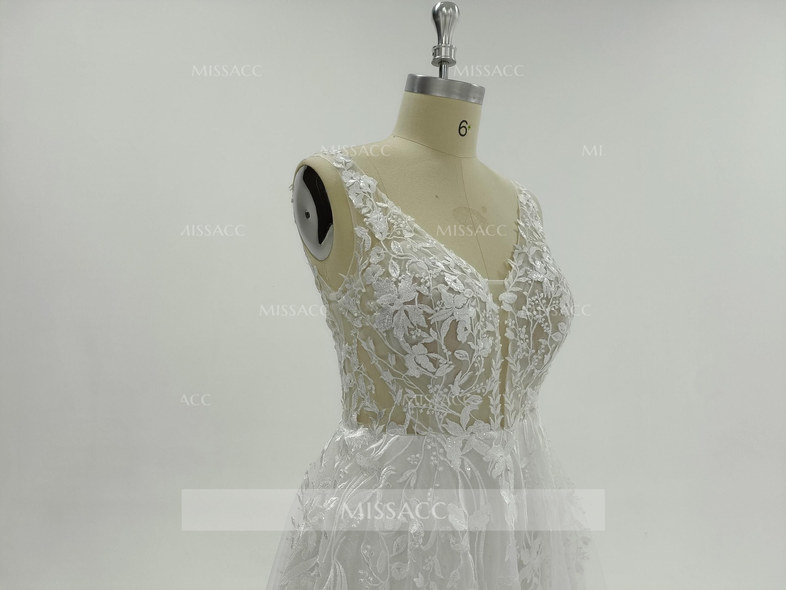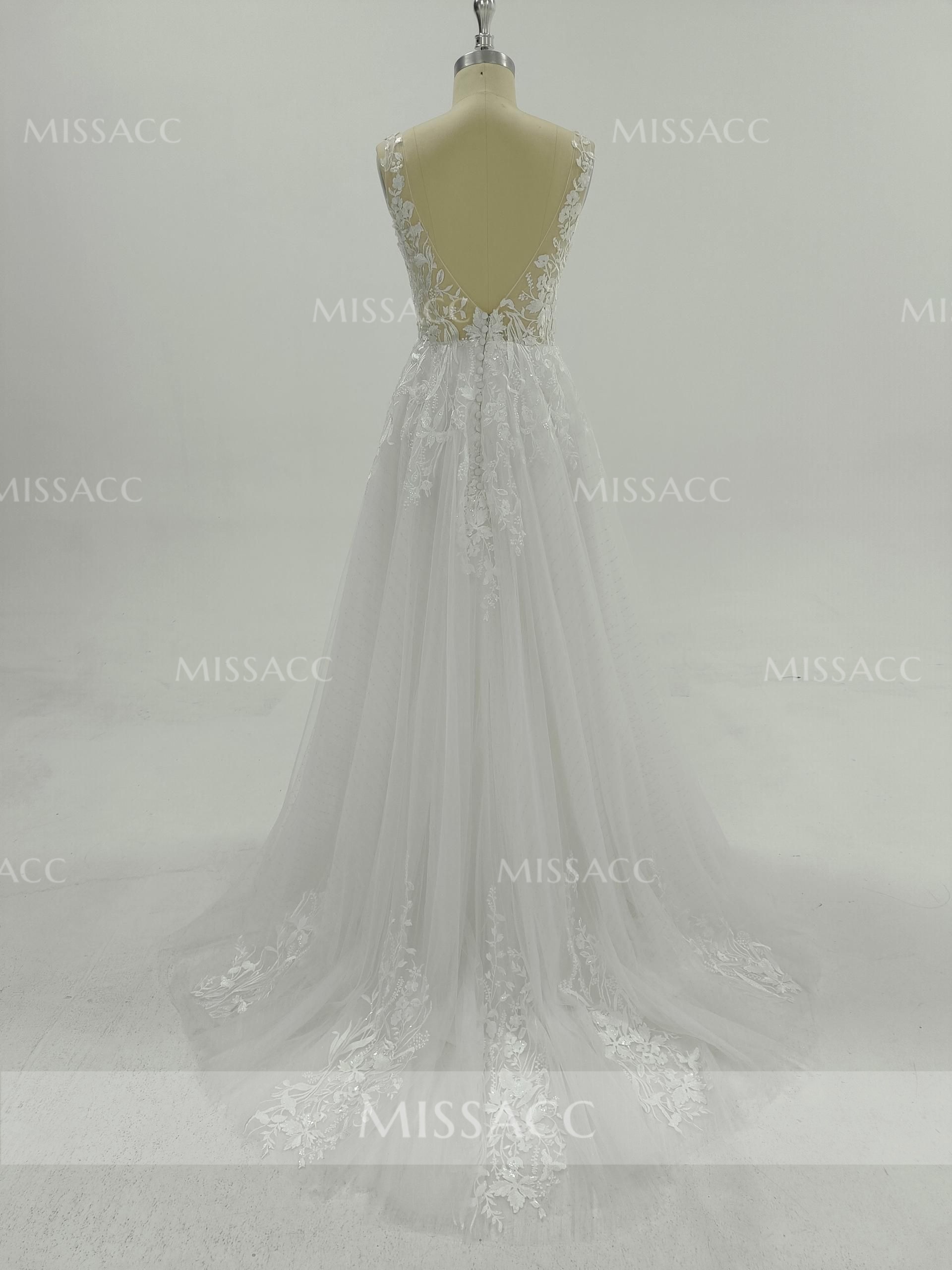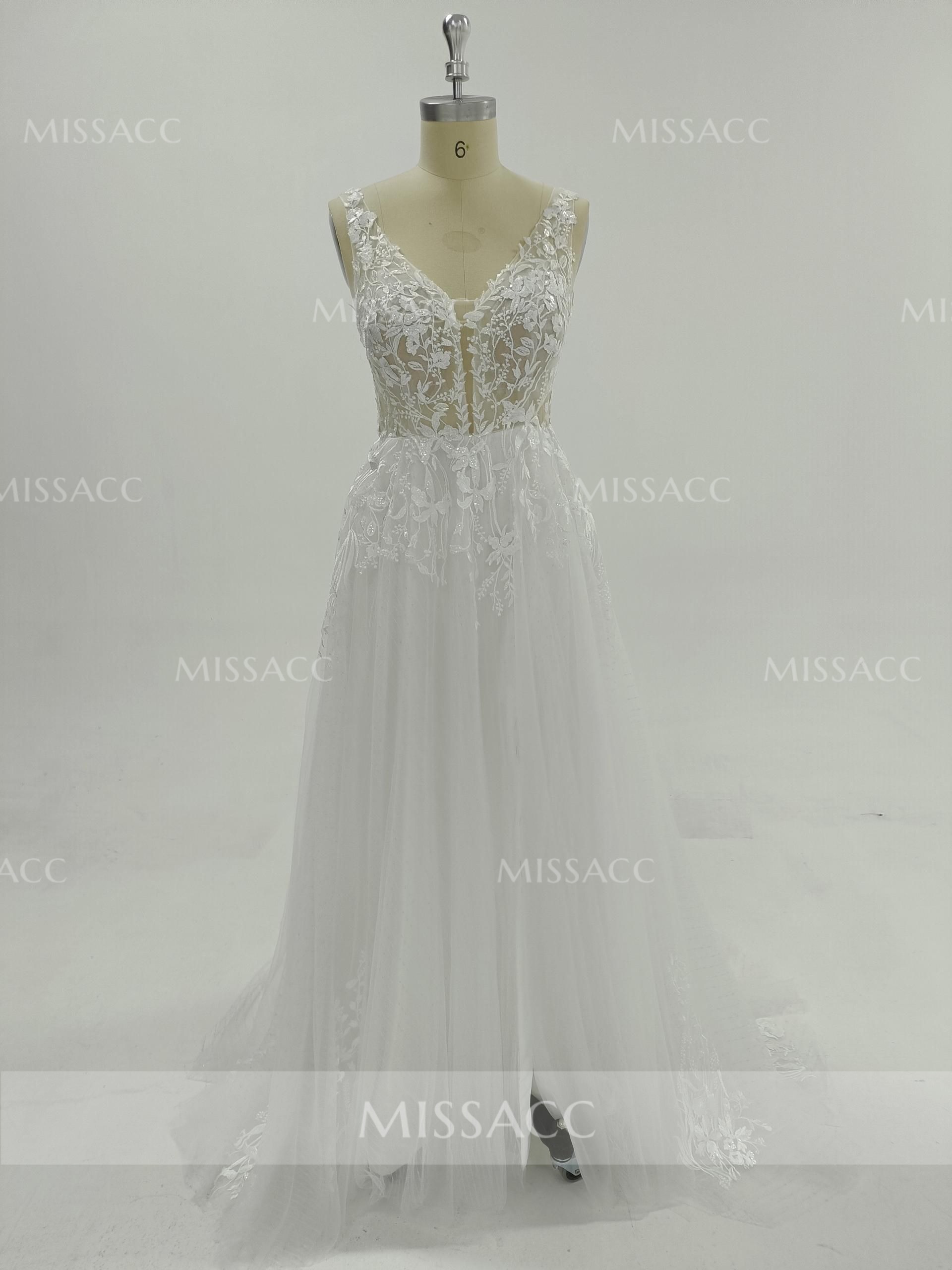 A-Line V-Neck Sleeveless Sweep Train Lace Wedding Dresses With Lace/High Split