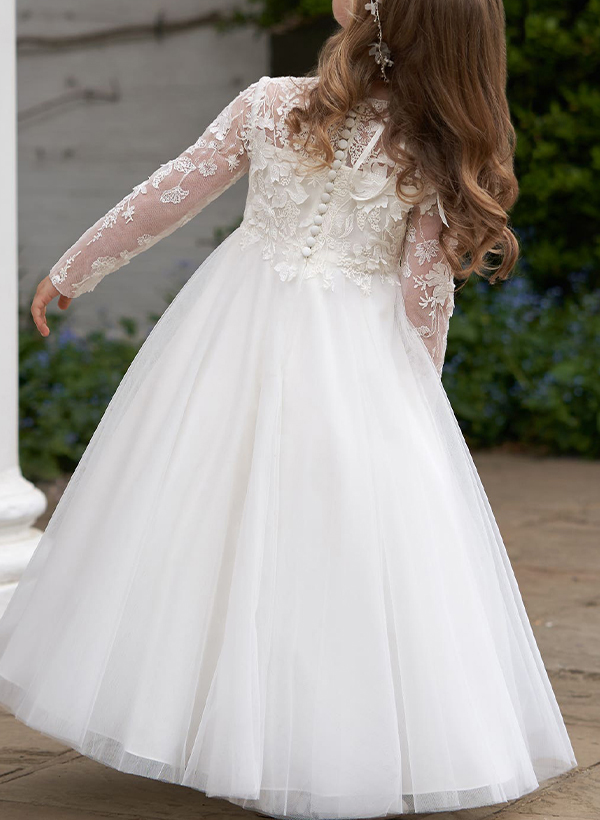 Ball-Gown Illusion Neck Long Sleeves Lace/Tulle Flower Girl Dresses With Lace