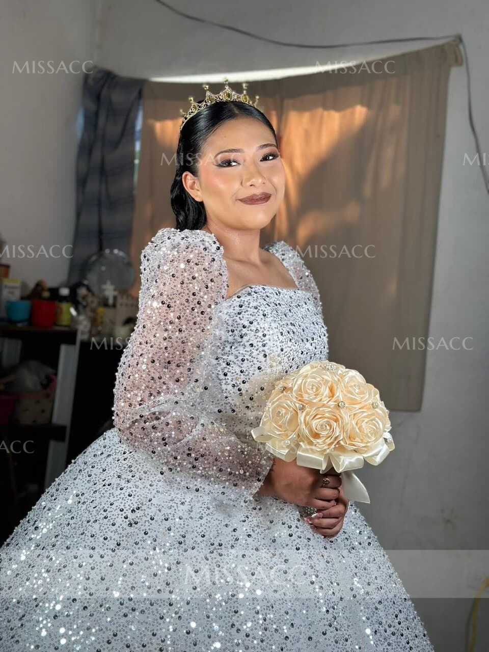 This gown is even more stunning in person than it appears online! The square neckline is absolutely perfect for my figure, and the sequin detailing adds just the right amount of sparkle. I received so many compliments on my wedding day!