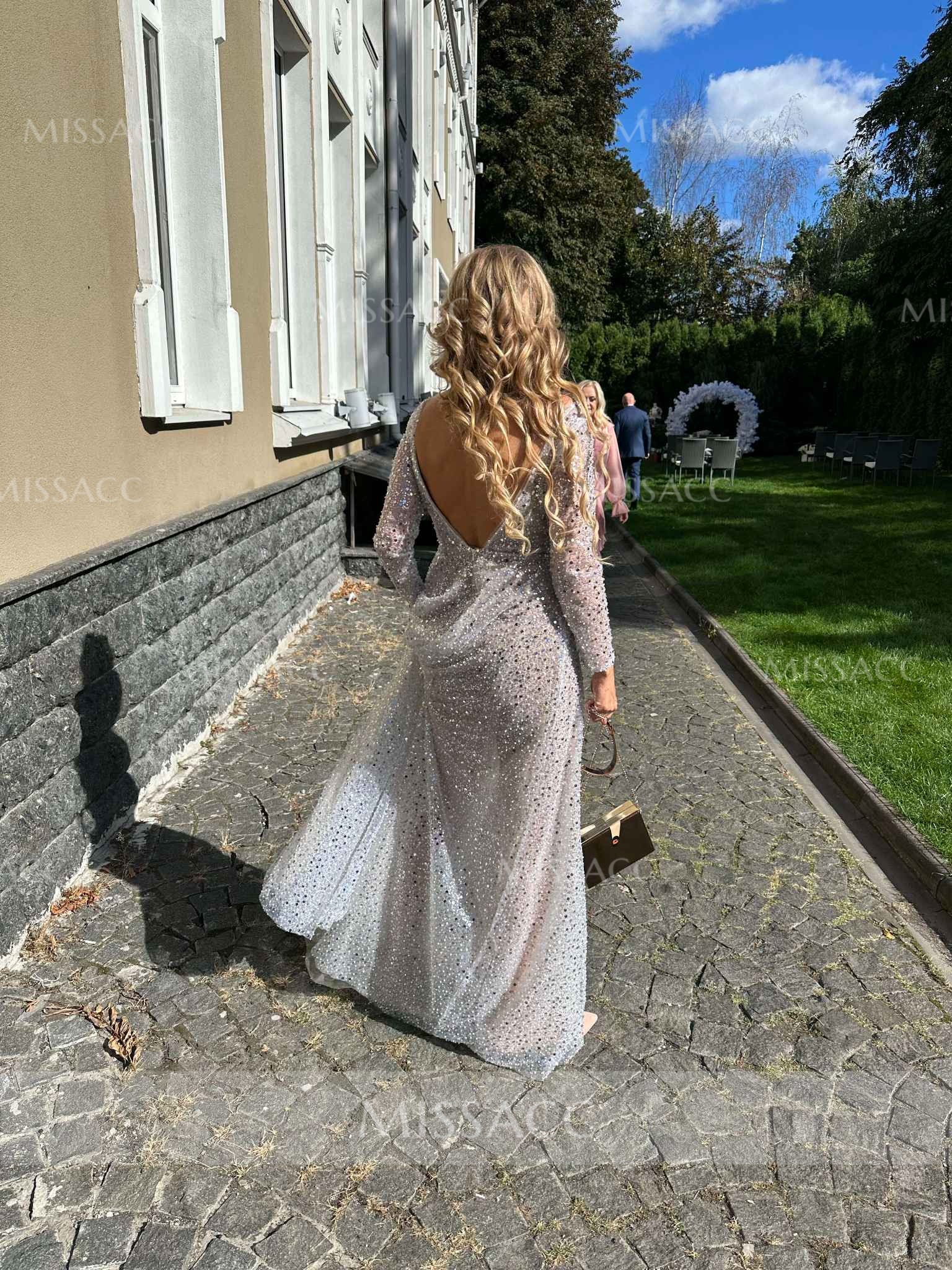 I wore this dress for my wedding and let me tell you, it was a total hit! The v-neck was flattering and the sequins added just the right amount of sparkle. The long sleeves were perfect for the evening chill and the sweeping train made me feel like royalty. I'm so glad I found this gem!