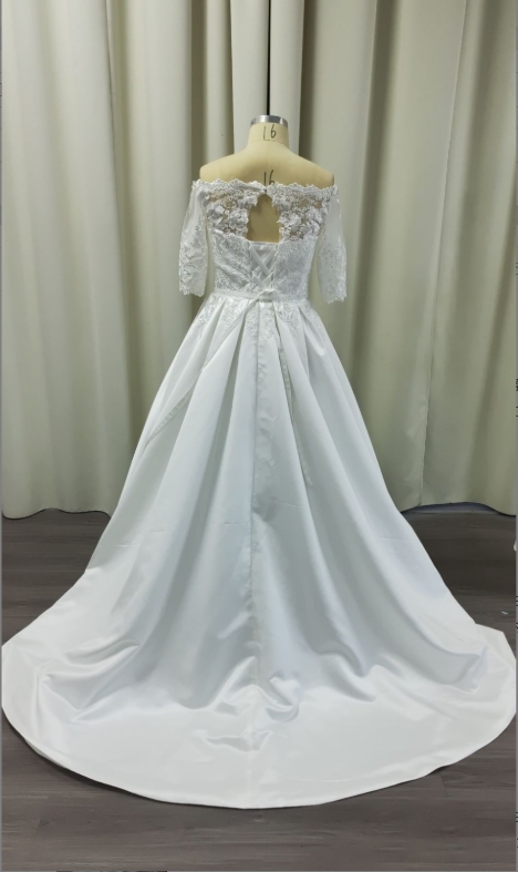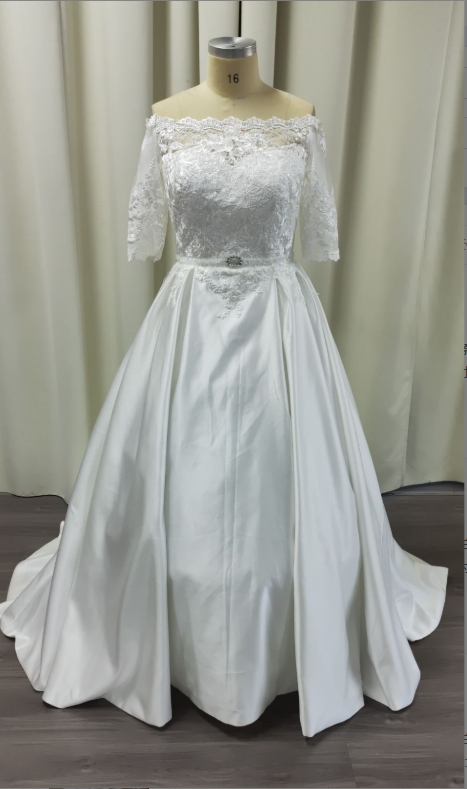 Discover our Classic Off-the-Shoulder Ball Gown Wedding Dress with Sleeves, crafted from luxurious fabric for a timeless look. Perfect for your special day, this elegant gown features a flattering silhouette and intricate detailing. Shop now for a memorable bridal experience.