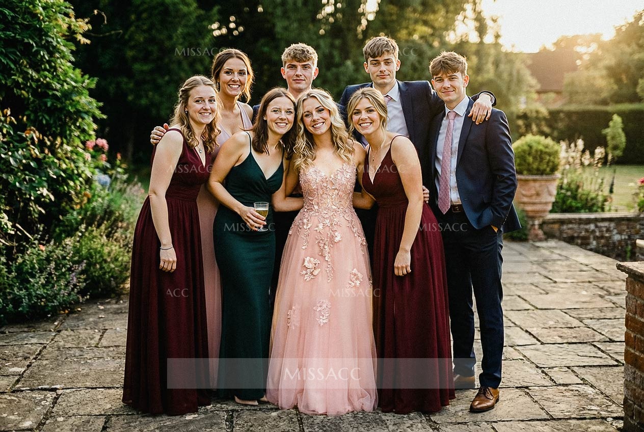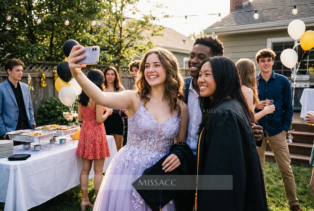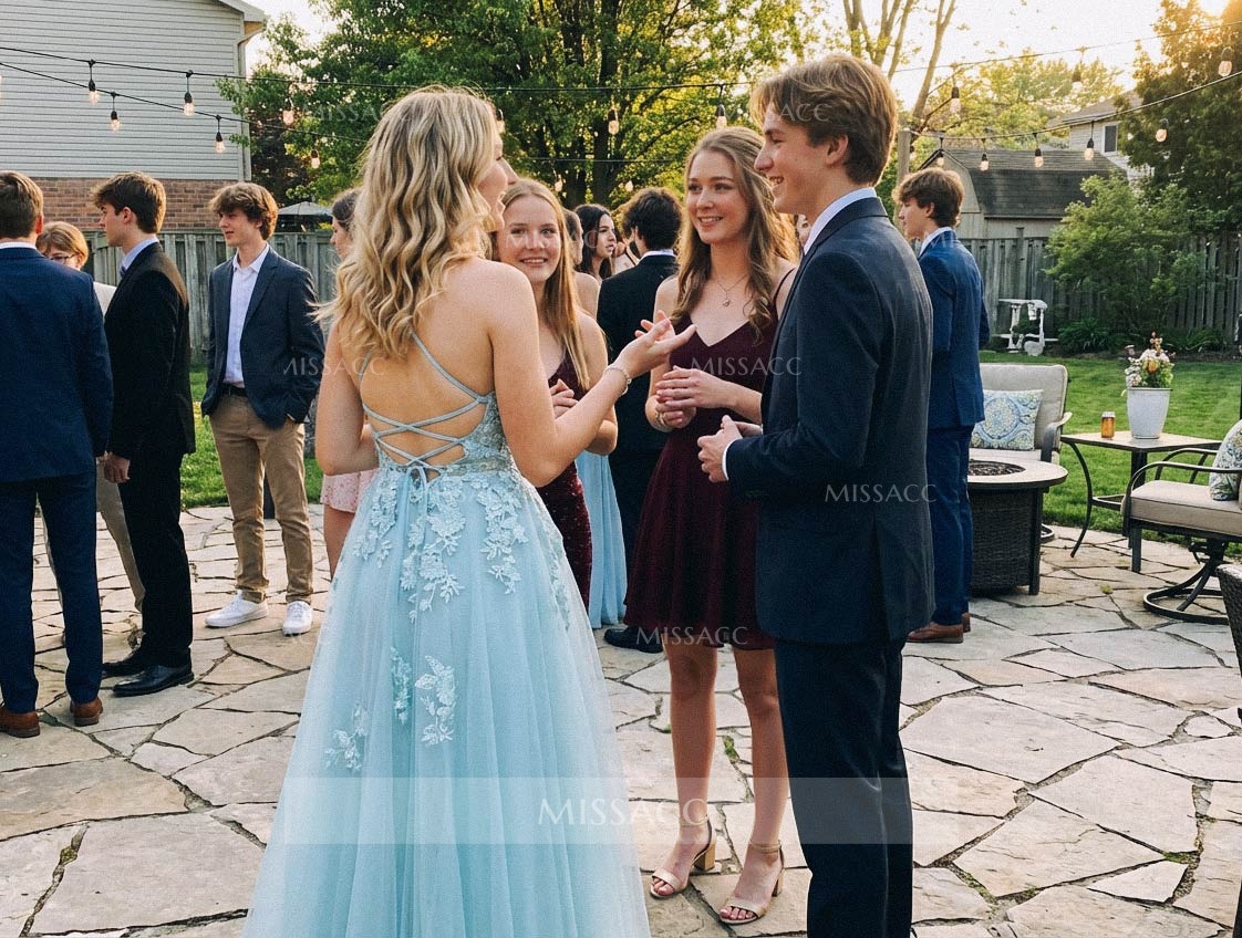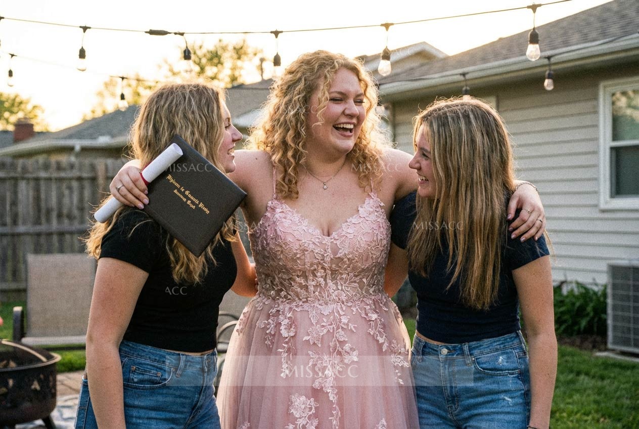Dreamy Lace V-Neck Illusion Corset A-Line Floor-Length Tulle Prom Dresses