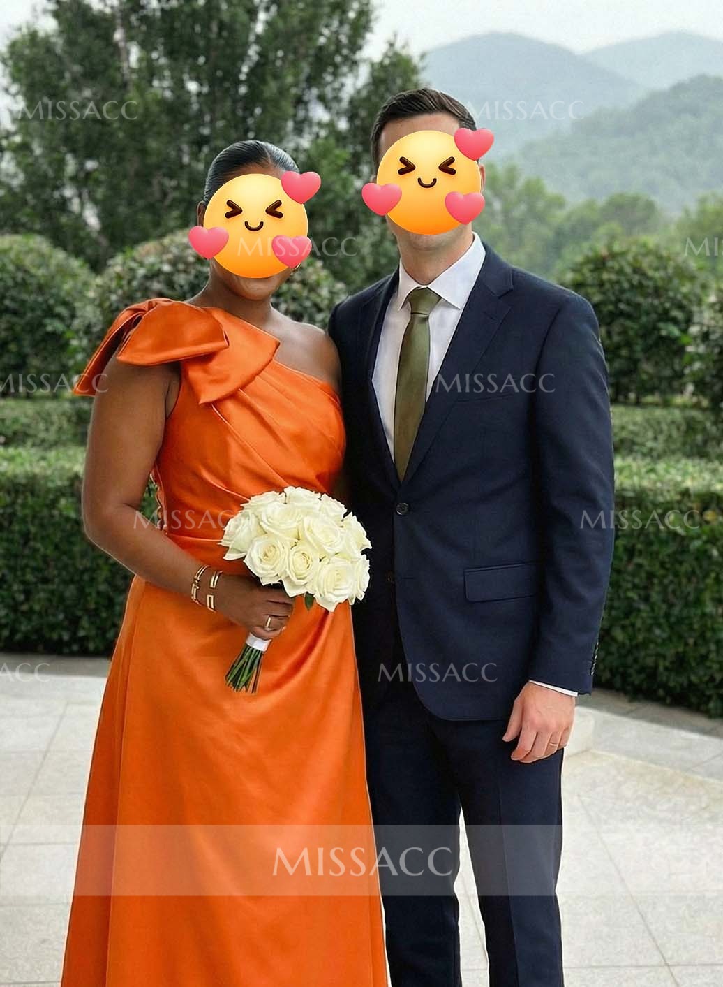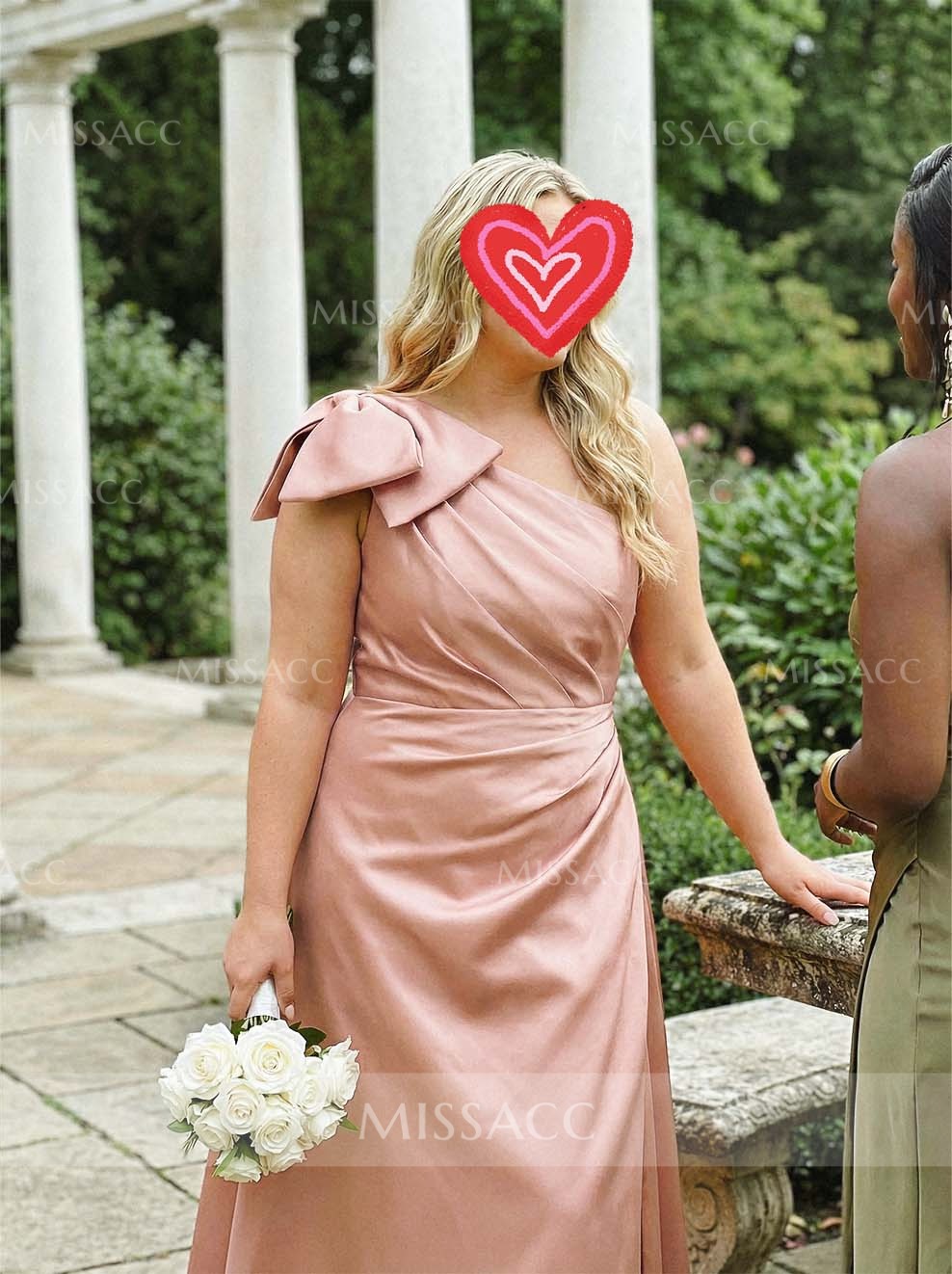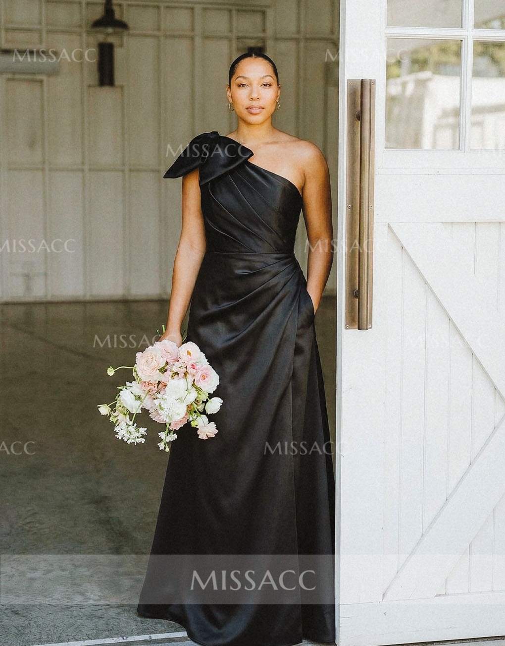 A satin A-line, floor-length bridesmaid dress featuring a striking one-shoulder design and a graceful bow accent. Perfect for weddings and formal events. Its luxurious fabric and sophisticated silhouette offer timeless elegance.
