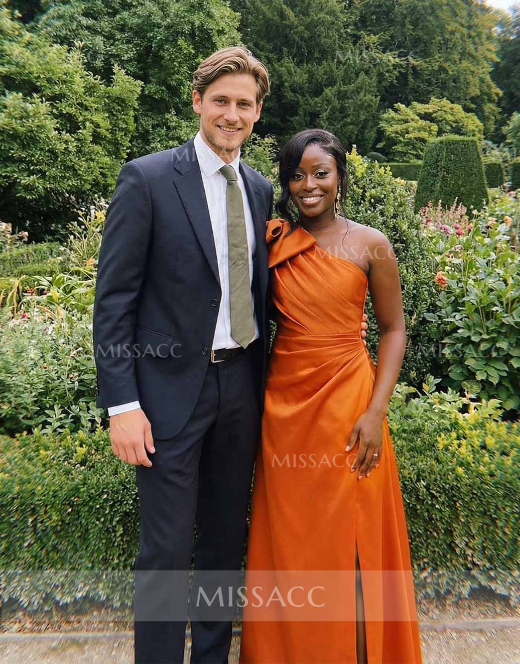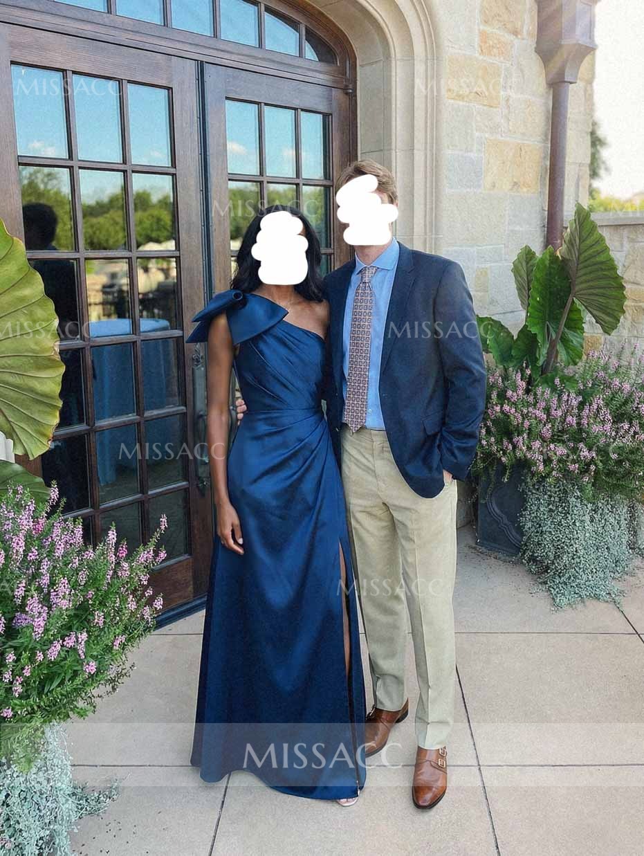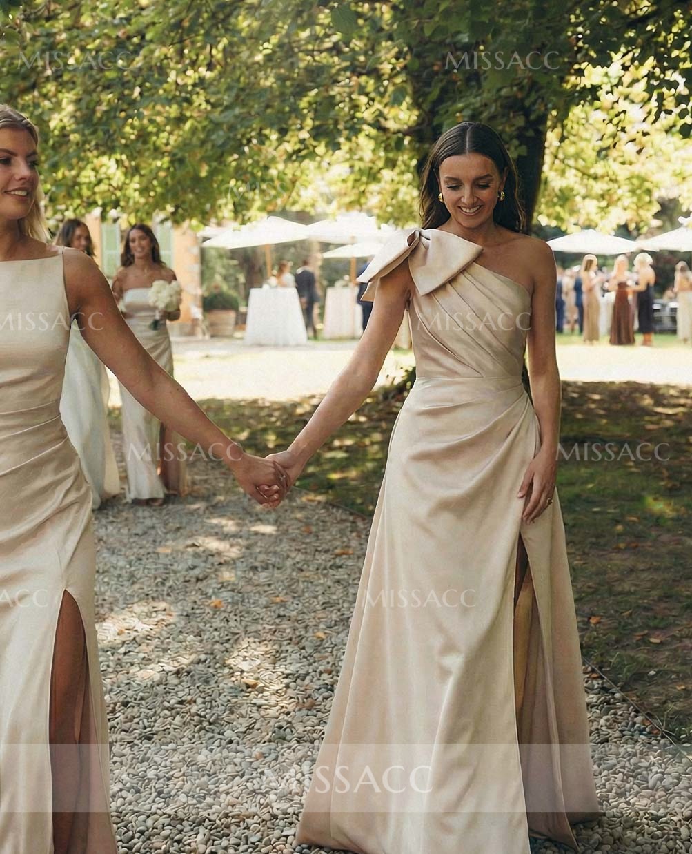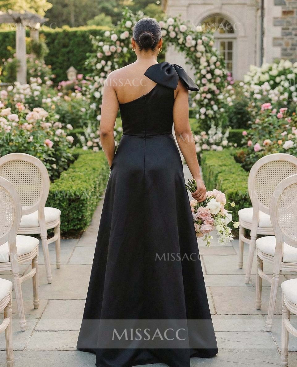 A satin A-line, floor-length bridesmaid dress featuring a striking one-shoulder design and a graceful bow accent. Perfect for weddings and formal events. Its luxurious fabric and sophisticated silhouette offer timeless elegance.