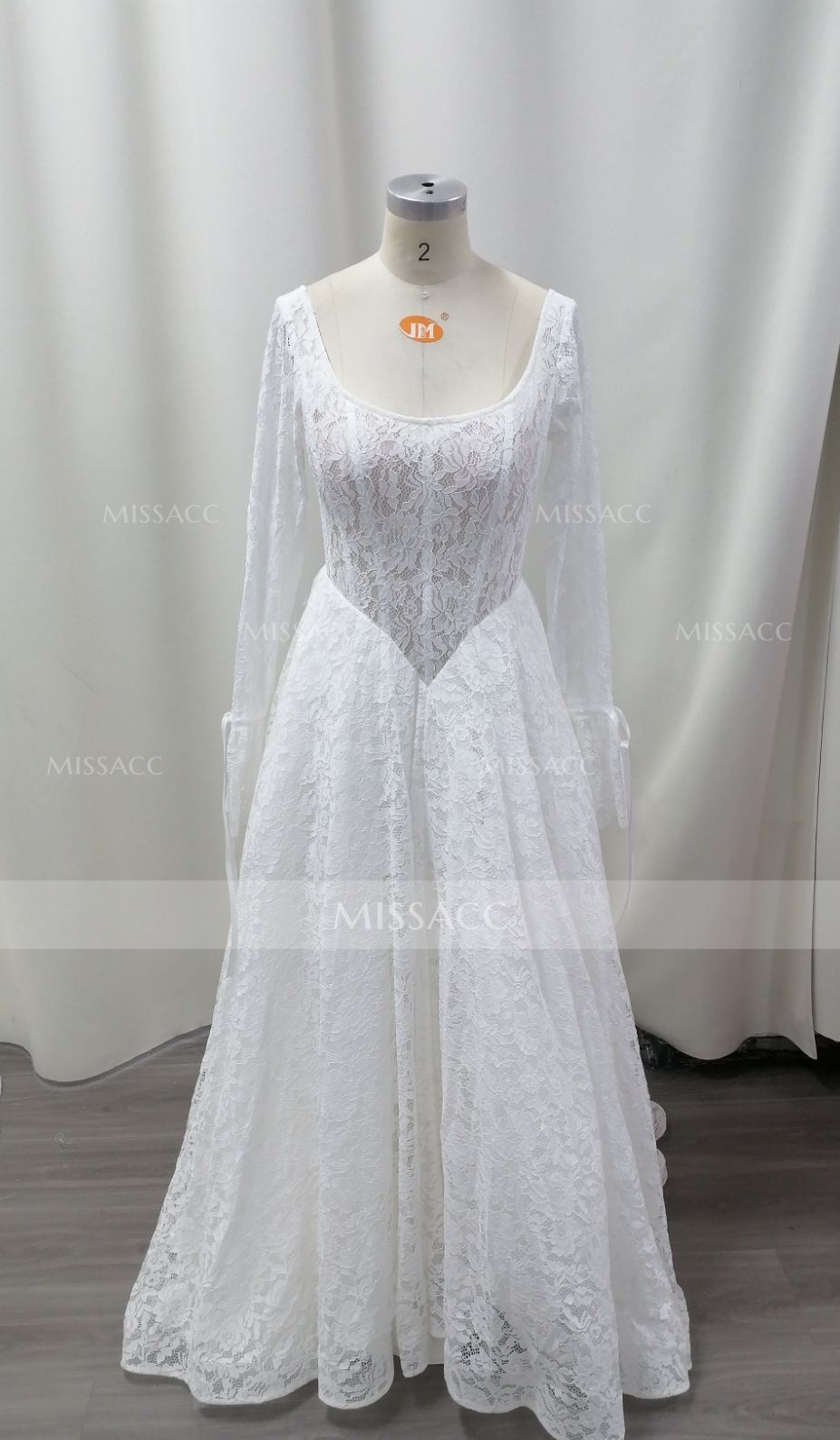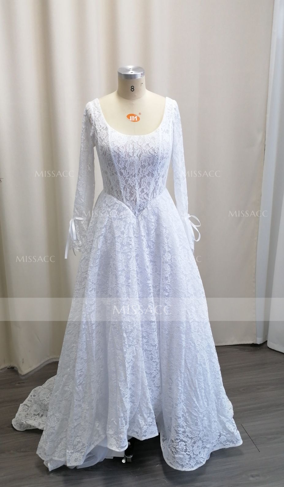 Crafted from premium lace, this A-line wedding dress features a romantic cowl neck and charming bow detail. Its long sleeves and court train create a timeless silhouette, perfect for church ceremonies or formal receptions. Shop this sophisticated bridal gown for your special day.