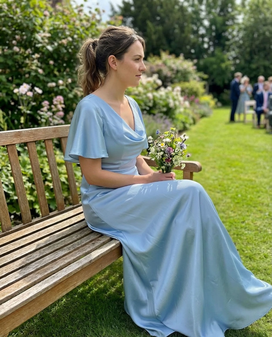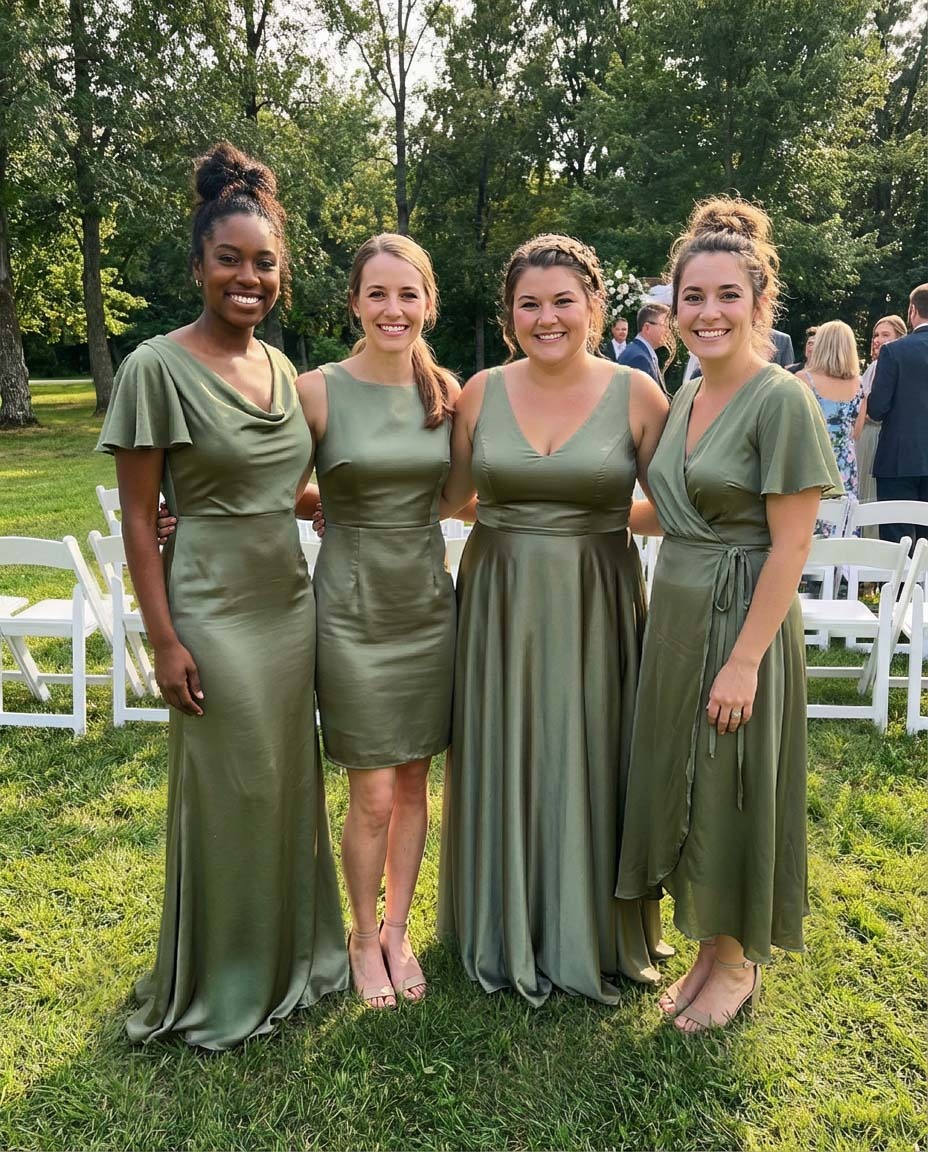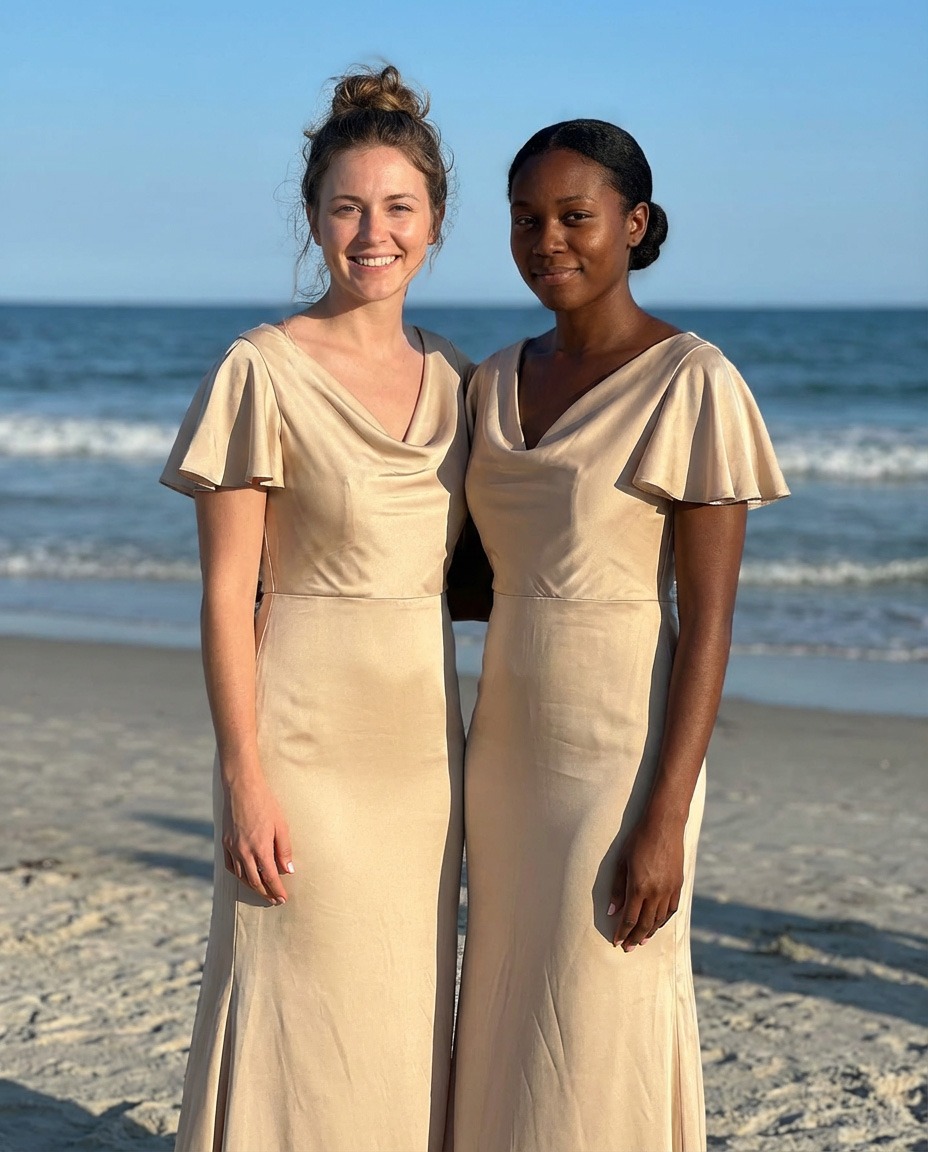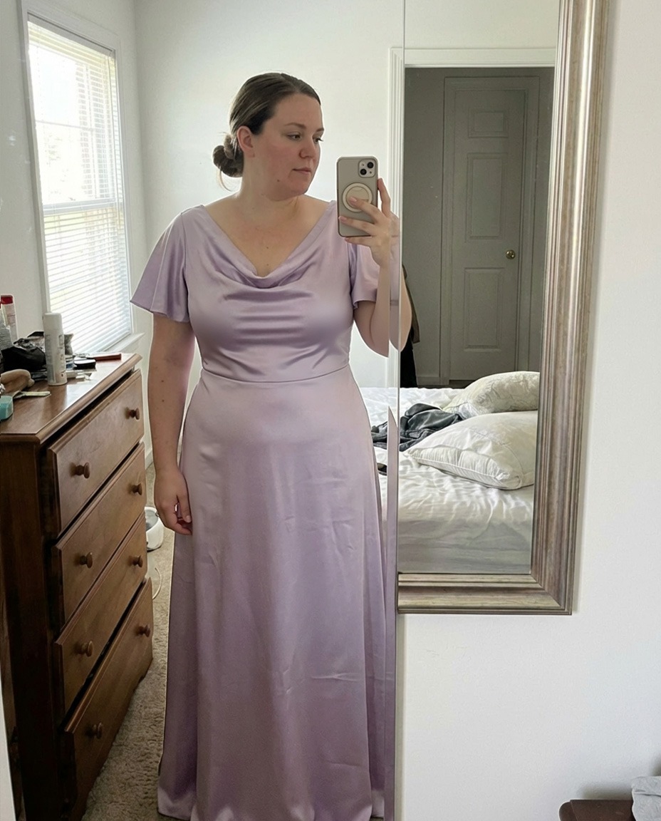 My sister chose this style for all of us bridesmaids, and at first, I wasn't sure about the short sleeves, but they are actually really cute. It flows beautifully when you walk, which looked great in the photos. I didn't even need to get it hemmed, which never happens to me. It’s just a solid, beautiful dress that made the day stress-free.