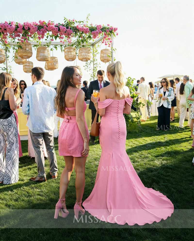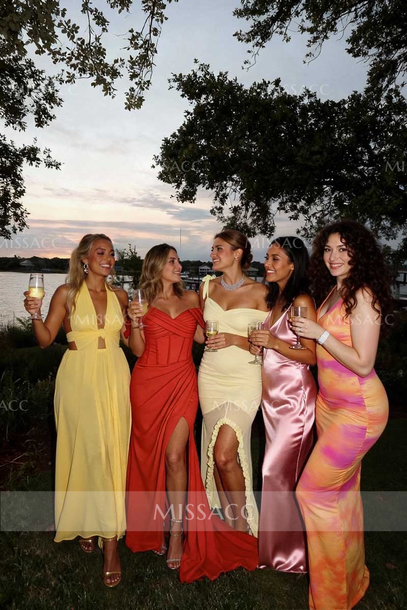 Shine in this stunning off-the-shoulder prom dress crafted from luxurious elastic satin. Featuring a daring high split and sweep train, this chic evening gown ensures a flattering fit for formal parties and balls. Shop this trendsetting style now.