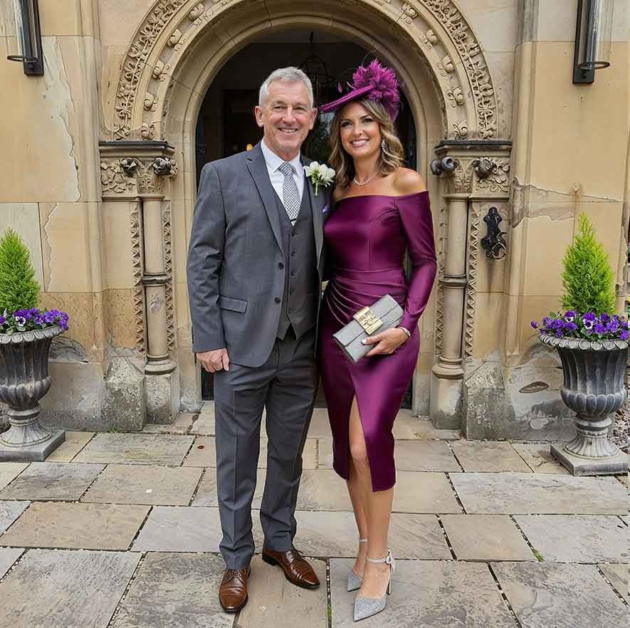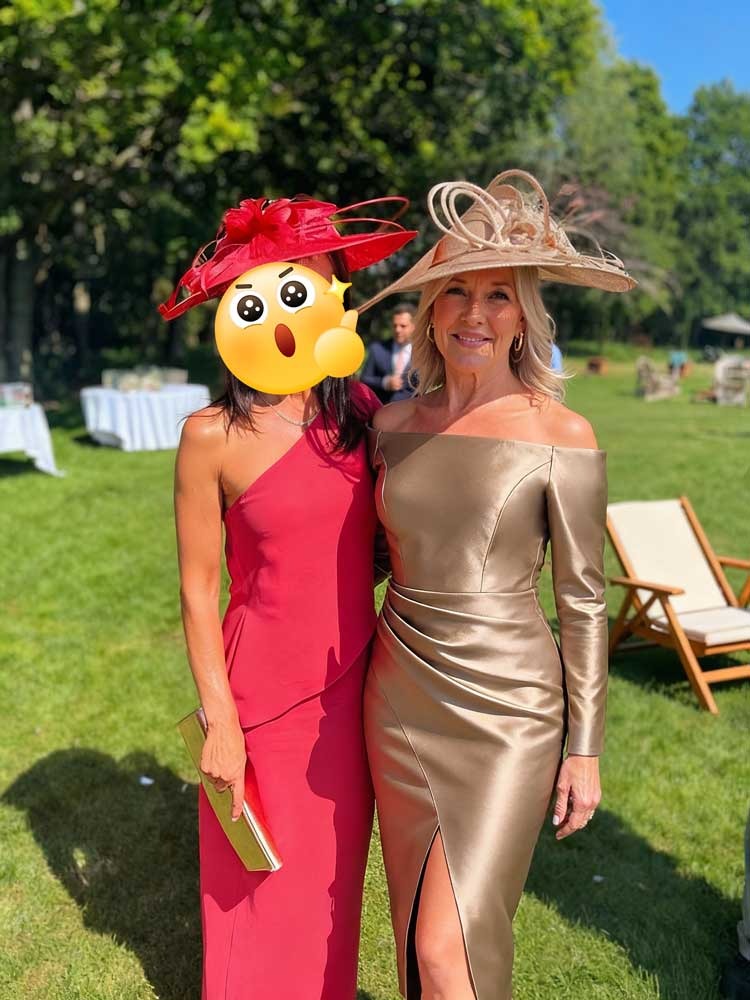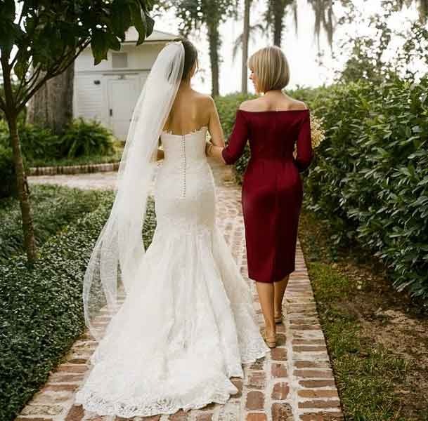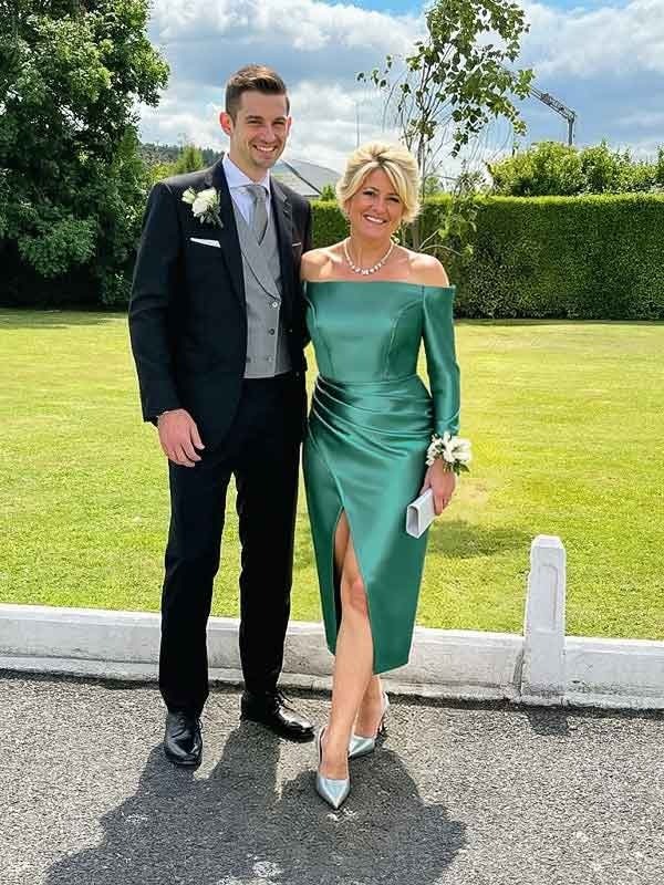 I wore this dress as a special guest and it was ideal for the outdoor ceremony. The knee-length cut and off-the-shoulder three-quarter sleeves are classic, while the smooth, figure-hugging fabric gives it a modern appeal. The back view is tailored and refined. It was easy to move around in and looked beautiful supporting the bride. A timeless, chic design for any garden or daytime wedding.