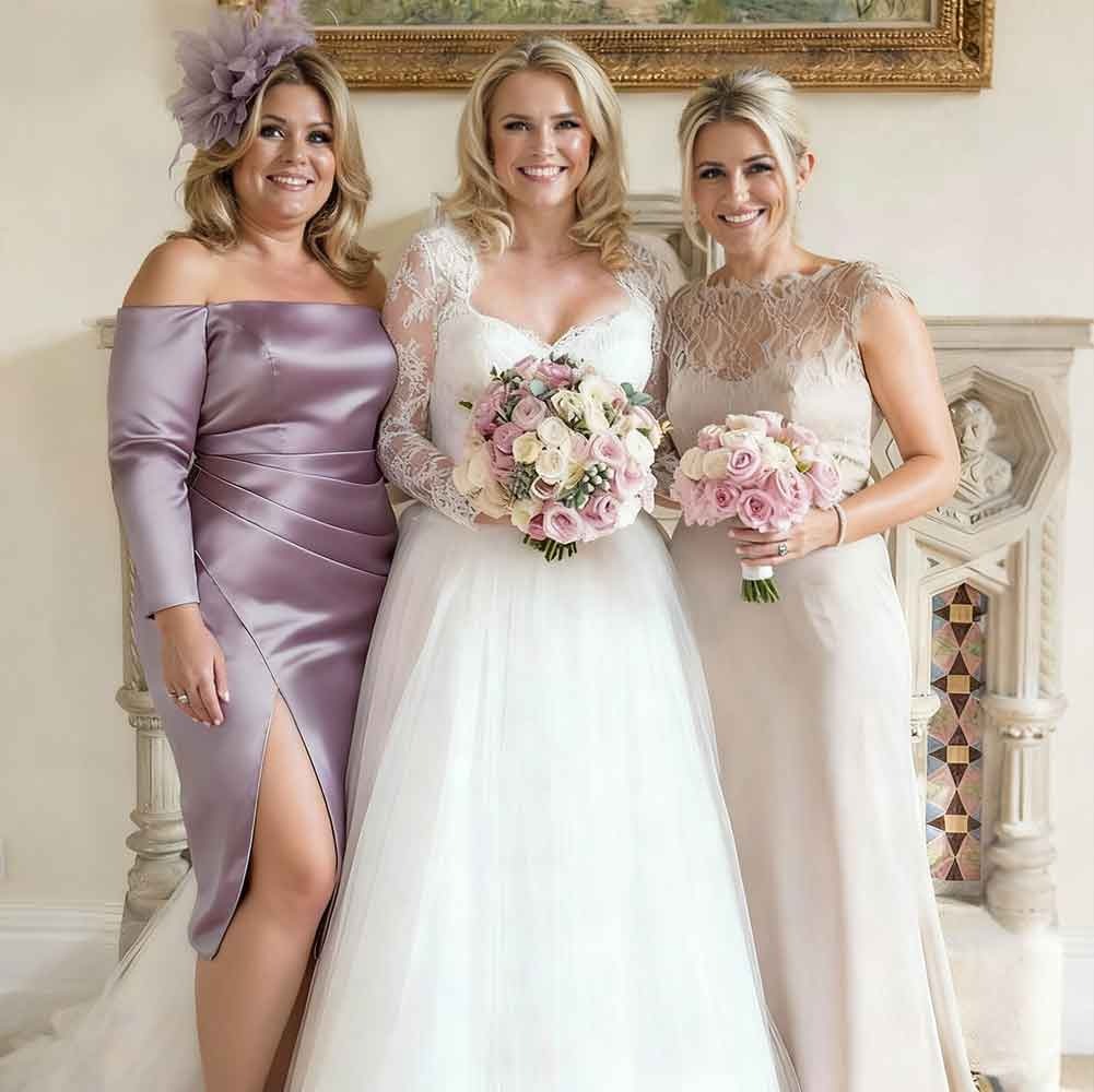 The satin-like fabric on the dress on the left is luxurious, and the off-the-shoulder neckline is very elegant. The draping detail and side slit create a lovely, flattering shape. It was comfortable and felt appropriate for a special role in the wedding party. The whole bridal party looked coordinated and chic. Highly recommend this style for anyone looking for sophisticated occasion wear.