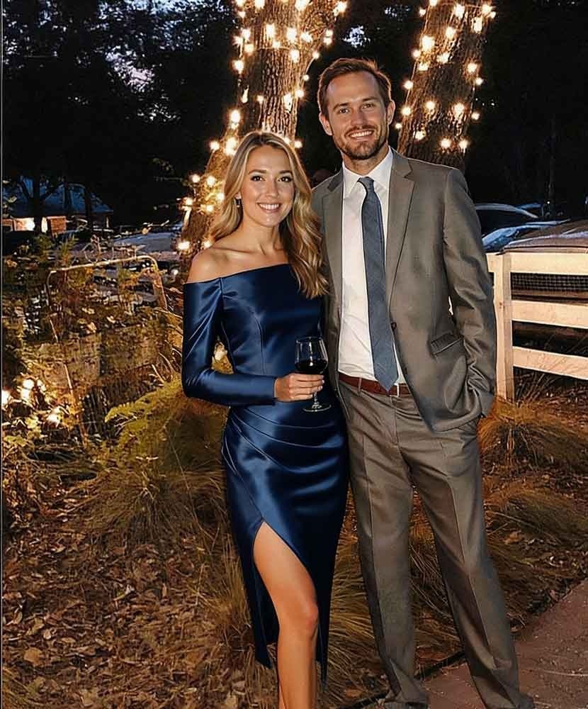 The off-the-shoulder neckline is incredibly chic and the long sleeves add a touch of sophistication perfect for a cool evening. The draping across the bodice is very flattering and the high slit gives it a modern edge. The fabric has a beautiful, rich sheen that catches the light wonderfully. It was comfortable and made me feel so glamorous next to my partner. A fantastic choice for a formal or black-tie optional event.