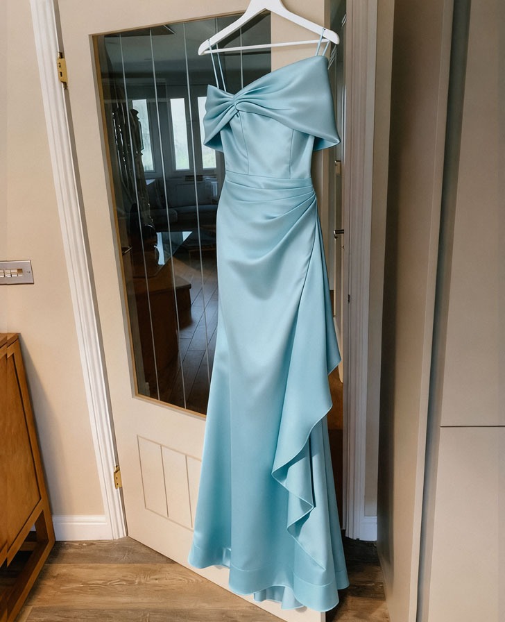 I was hesitant to buy a dress online for such an important day (my daughter's wedding!), but the reviews convinced me. I’m glad I did. The "Dusty Blue" color is exactly like the swatch online. It matches the bridal party perfectly. The dress arrived inside out to protect the satin, which I appreciated. It did need a good steaming, but that's expected. It fits true to size, maybe a little generous in the bust area. If you are smaller chested, you might need to take it in a pinch. Otherwise, beautiful dress.