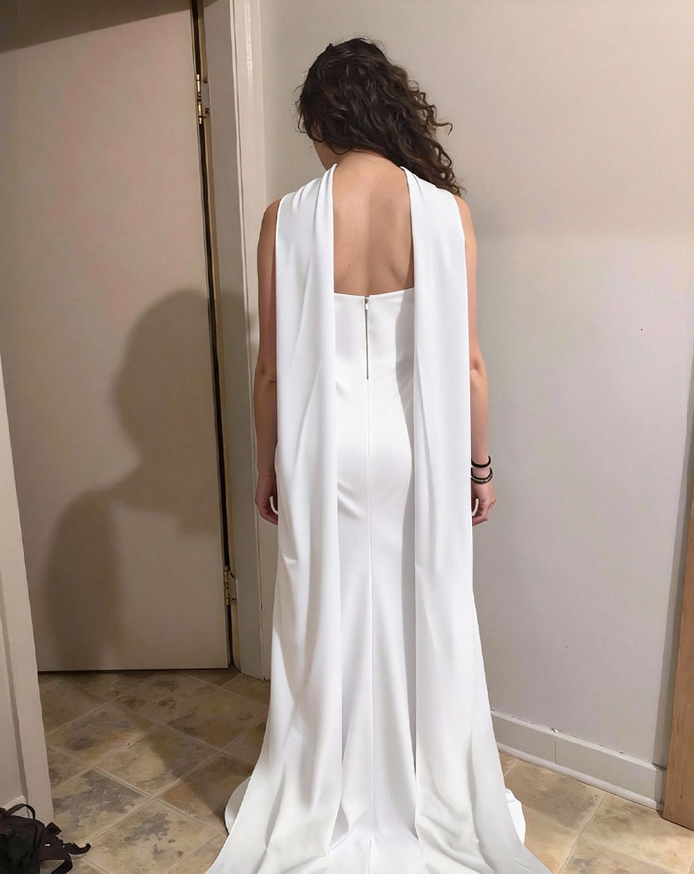 I was looking for something budget-friendly for my backyard elopement and stumbled upon this gem. I was blown away by how flattering the fit was straight out of the bag. The material is thick enough to hide everything but still soft against the skin. It’s very minimalist, which I love, because I could go crazy with my accessories and bouquet. If you are between sizes, I'd suggest sizing up just to be comfortable, but overall, a solid 8/10 purchase.