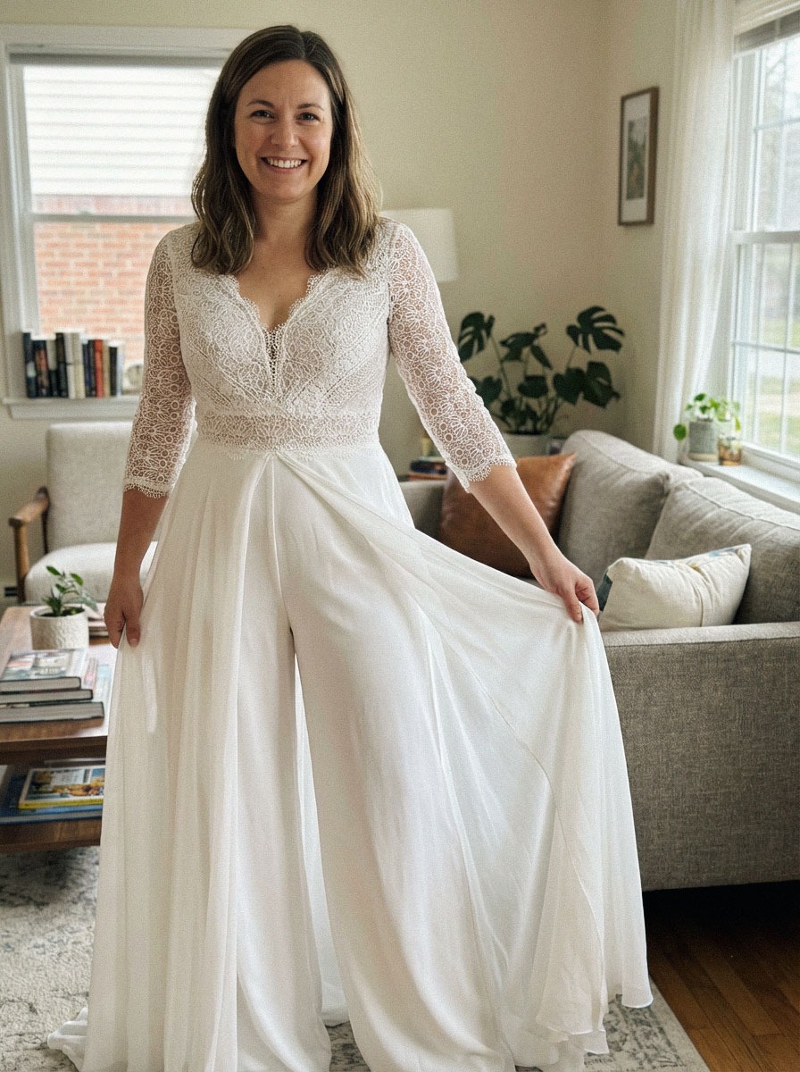 This dress is a dream! The sweep train adds a touch of drama, and the 3/4 sleeves are perfect for a bit of coverage. It's a bit more than I wanted to spend, but the style and comfort make it worth every penny.