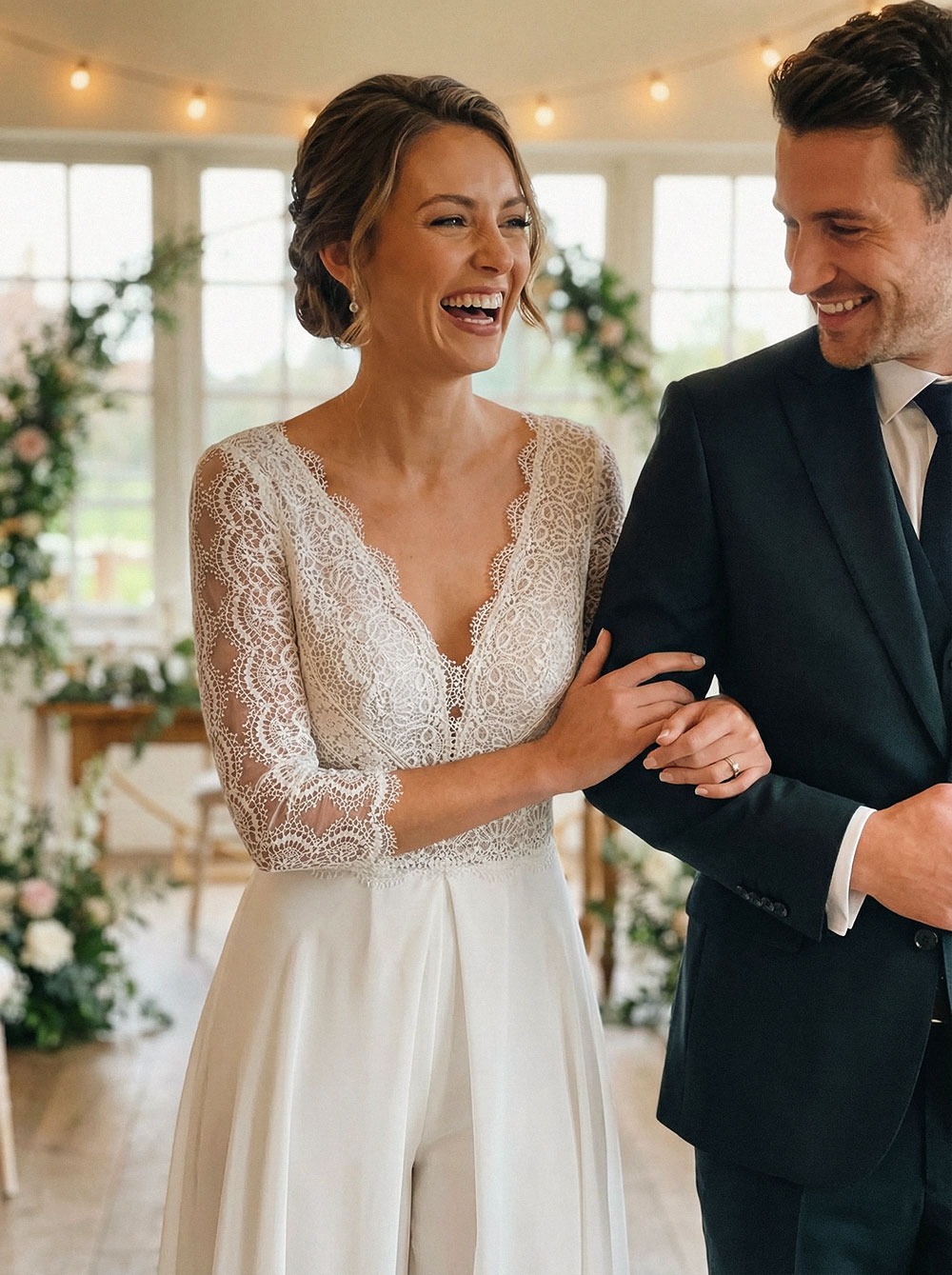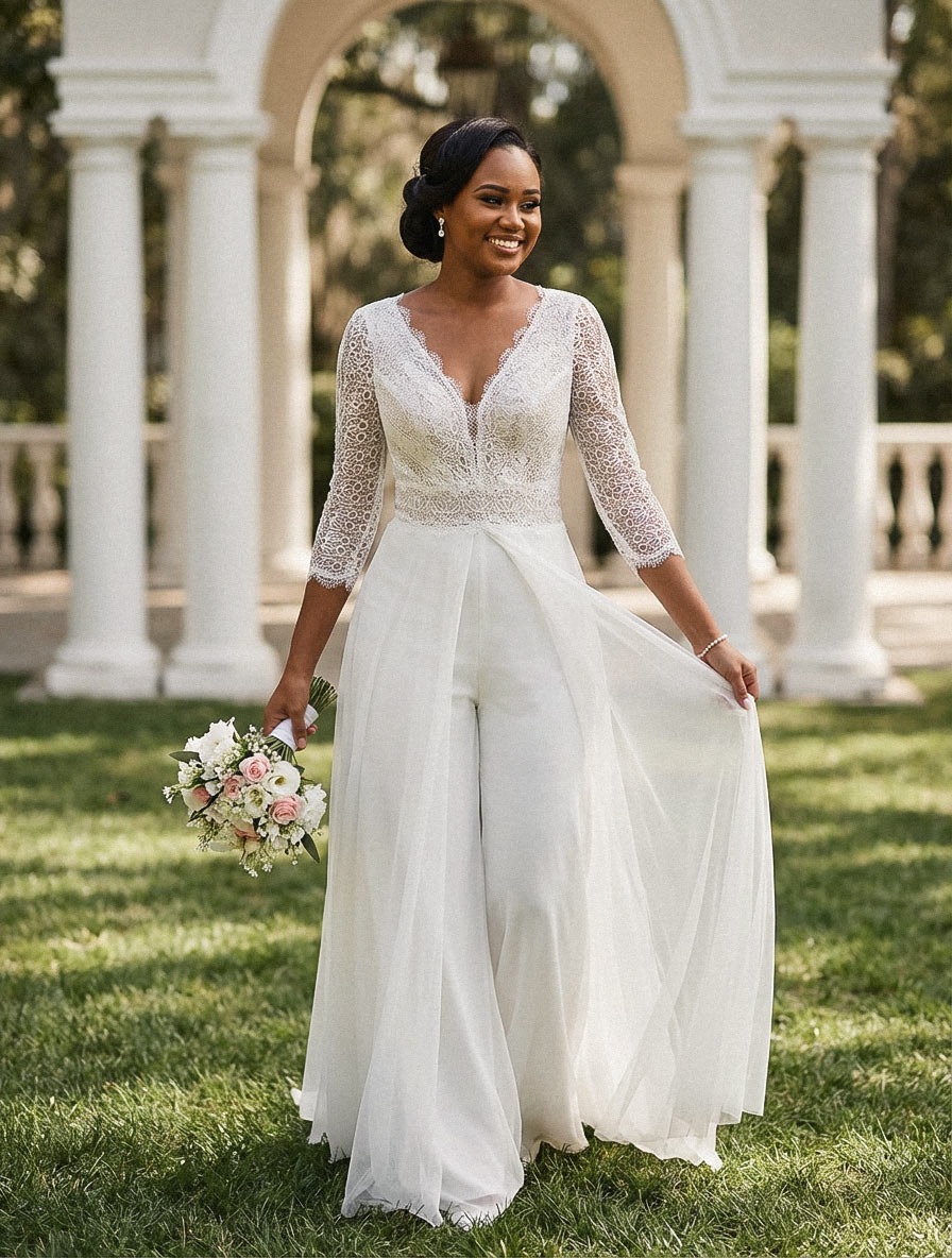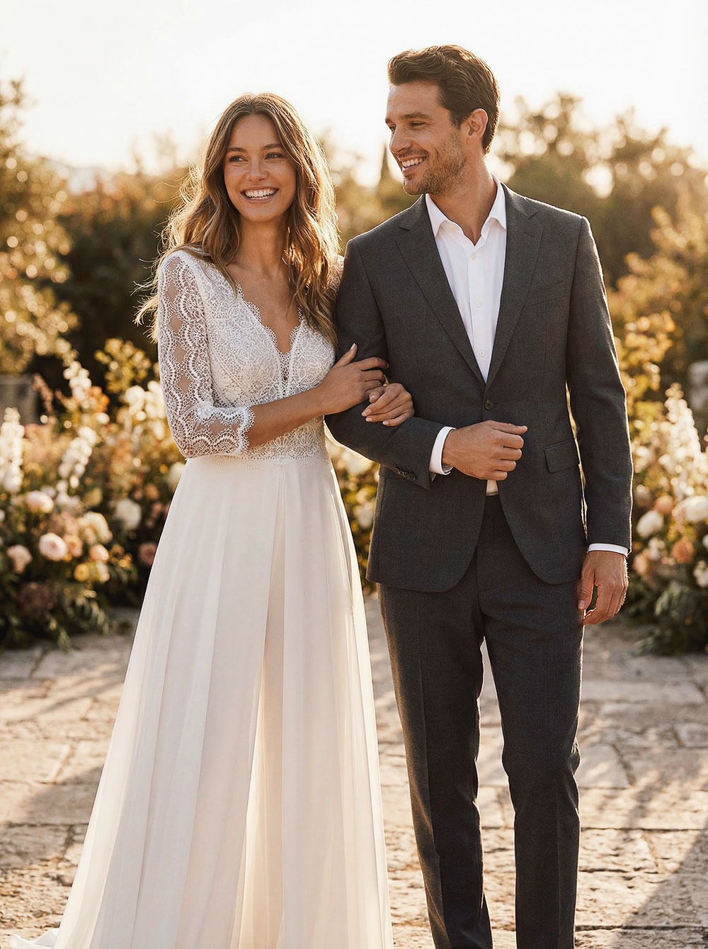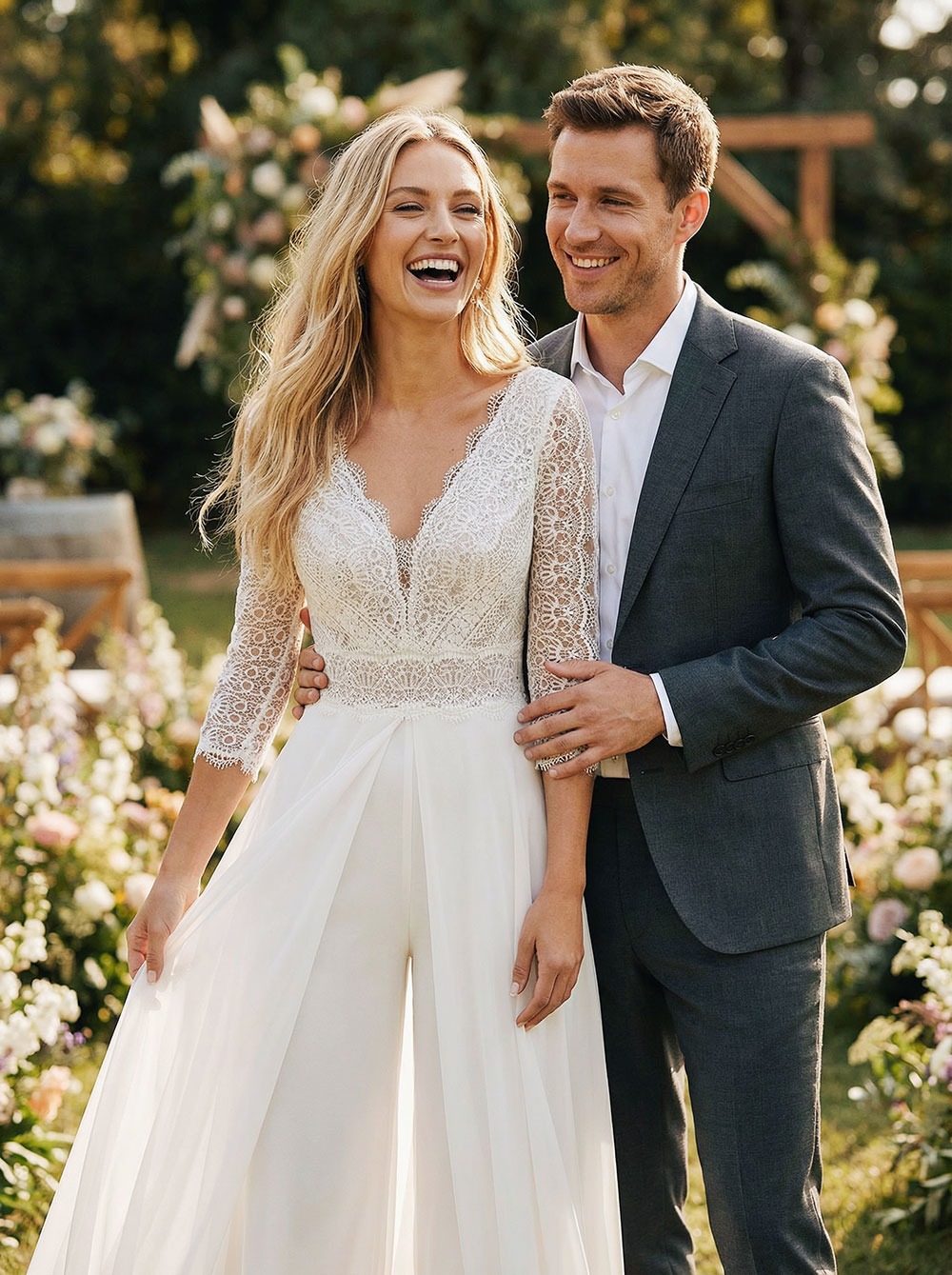 Exquisite lace and flowing chiffon define this breathtaking bridal gown. Featuring a flattering V-neck and elegant 3/4 sleeves, this sweeping train dress promises a sophisticated and romantic wedding day look. Perfect for classic ceremonies and destination weddings. Designed for the modern bride seeking timeless grace.