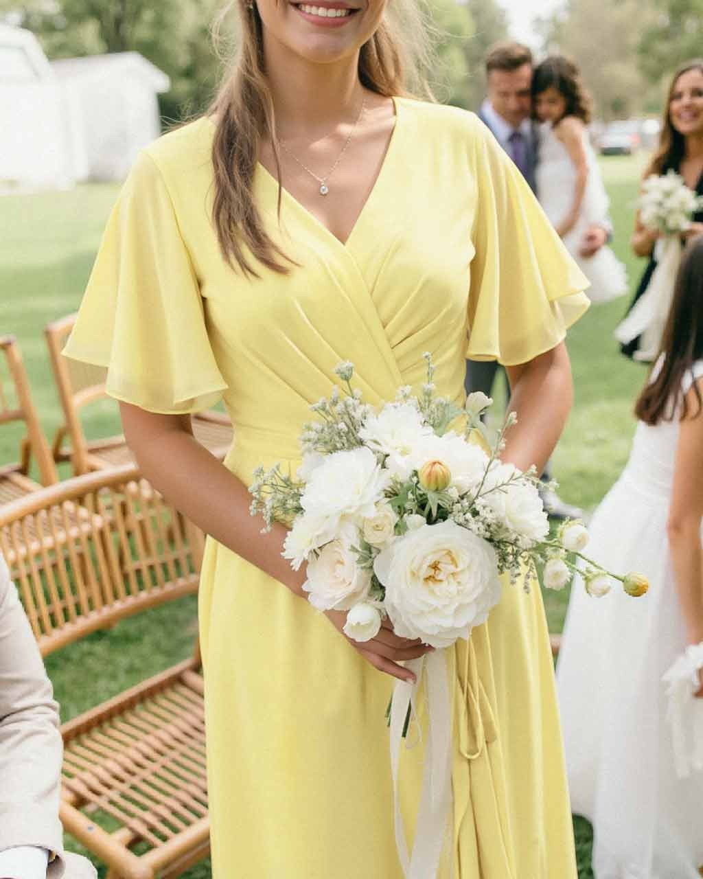 Made from lightweight chiffon, this dress drapes elegantly to the floor, with a front slit for a modern twist. The charming flutter sleeves and v-neckline create a soft look, while the bow sash cinches the waist. Ideal for weddings or formal occasions, this dress exudes effortless charm.