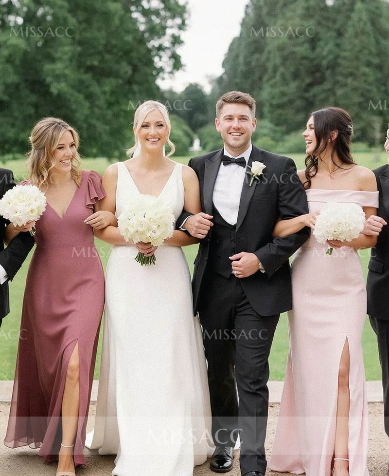 We chose the Royal Blue for a pop of color, and let me tell you, it was a showstopper! The color is even more vibrant in person. The tailoring on this V-neck style is fantastic—it held its shape through the whole reception, even during the toasts. The Chiffon skirt has a beautiful flow when you walk, and the high slit adds just the right amount of edge. Truly a gorgeous, well-made dress that flatters everyone.