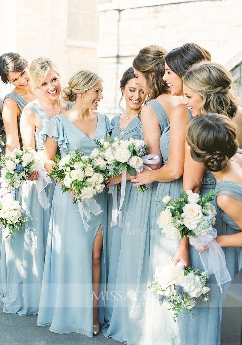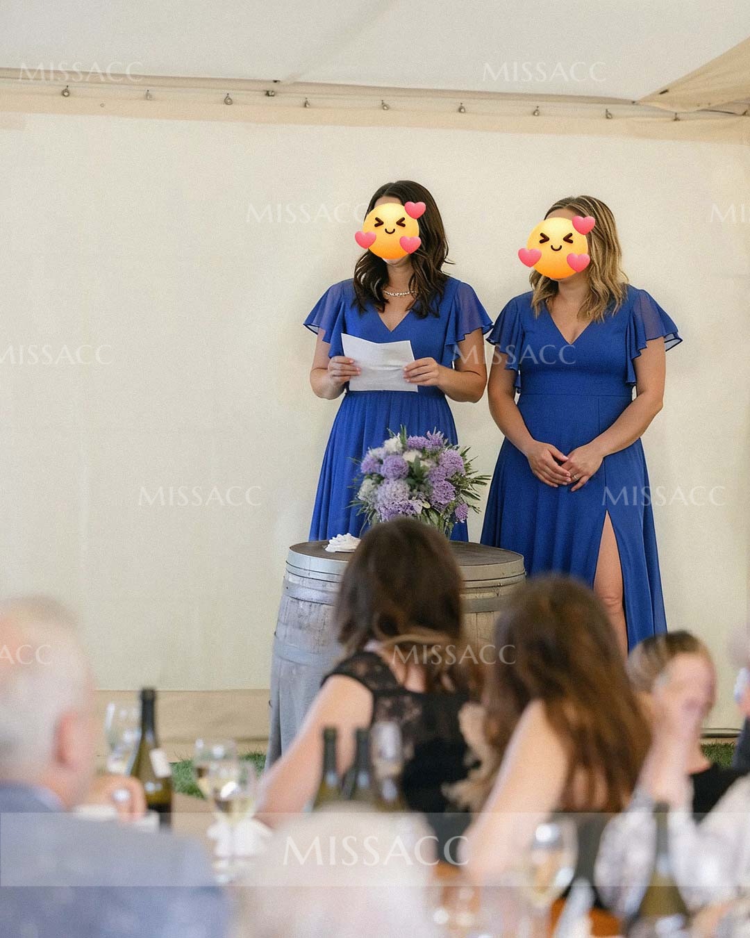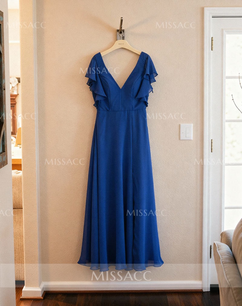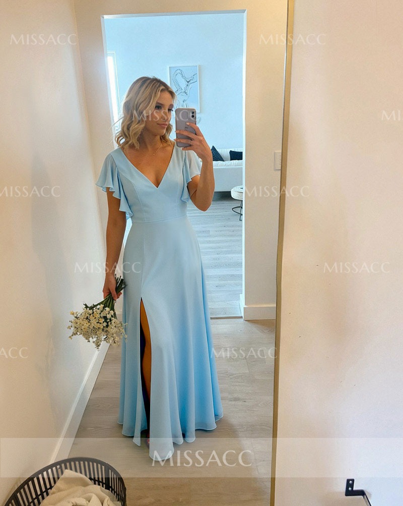 Stunning A-line chiffon bridesmaid dresses featuring V-neck, ruffle sleeves, and high split design. Perfect for weddings and formal evening parties. Breathable fabric ensures comfort and style. Shop this chic look now.