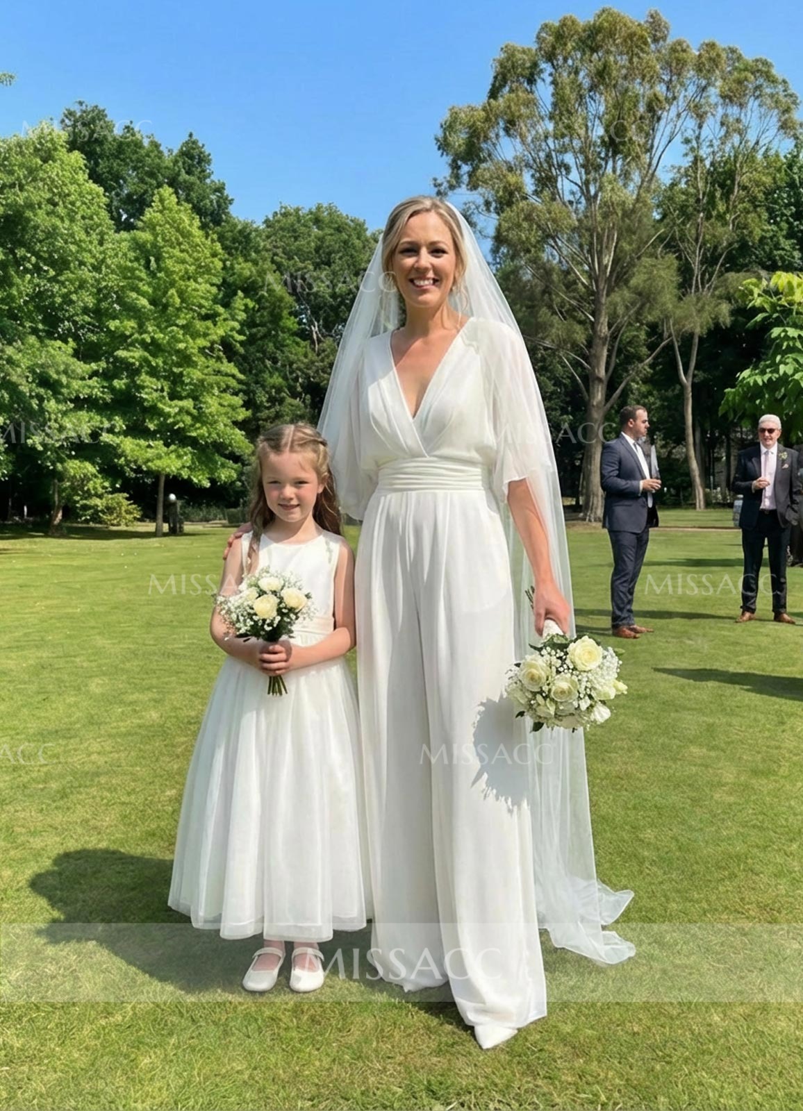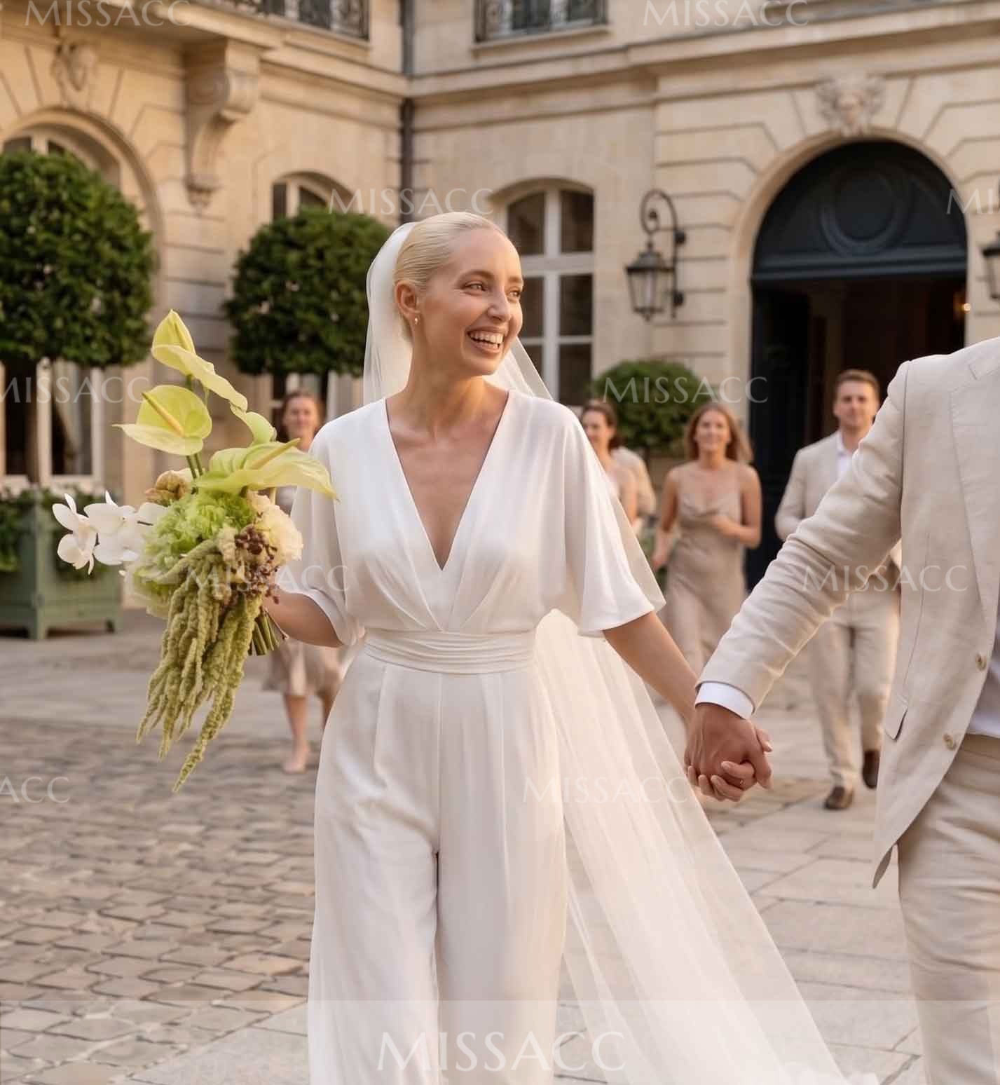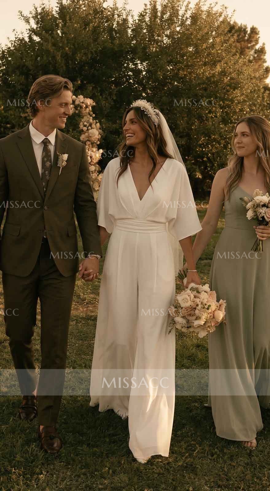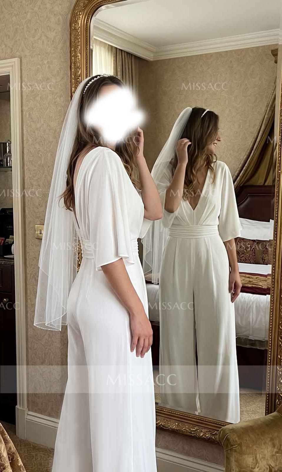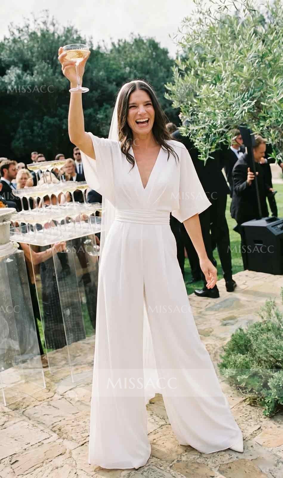Elegant Jumpsuit Pant Suit with a V-neck and 1/2 sleeves, perfect for a sophisticated wedding look. Floor-length design adds a touch of grace to any special occasion.