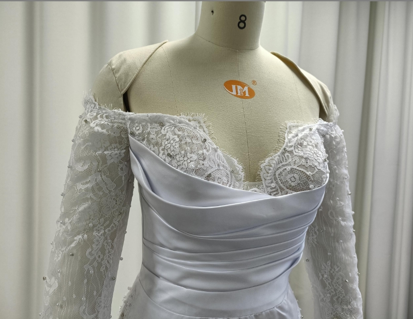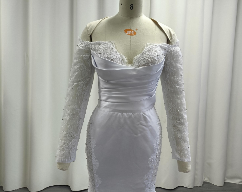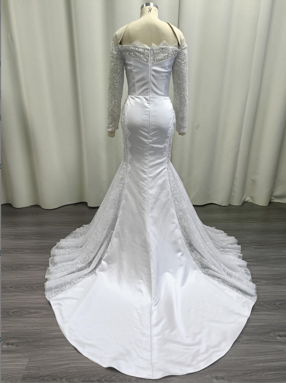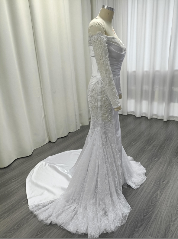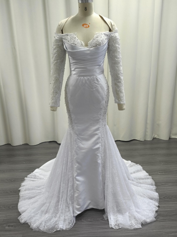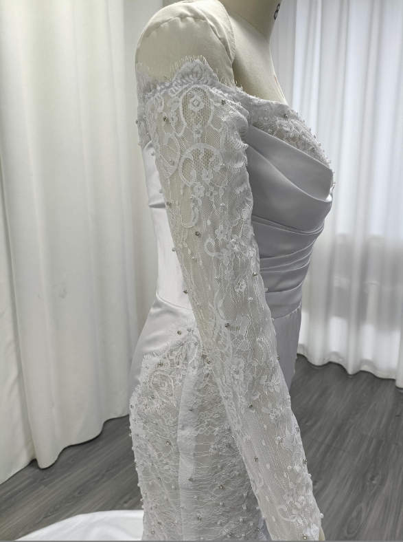 Elegant lace trumpet mermaid wedding dress with off-the-shoulder design and pearl accents, perfect for a romantic ceremony.