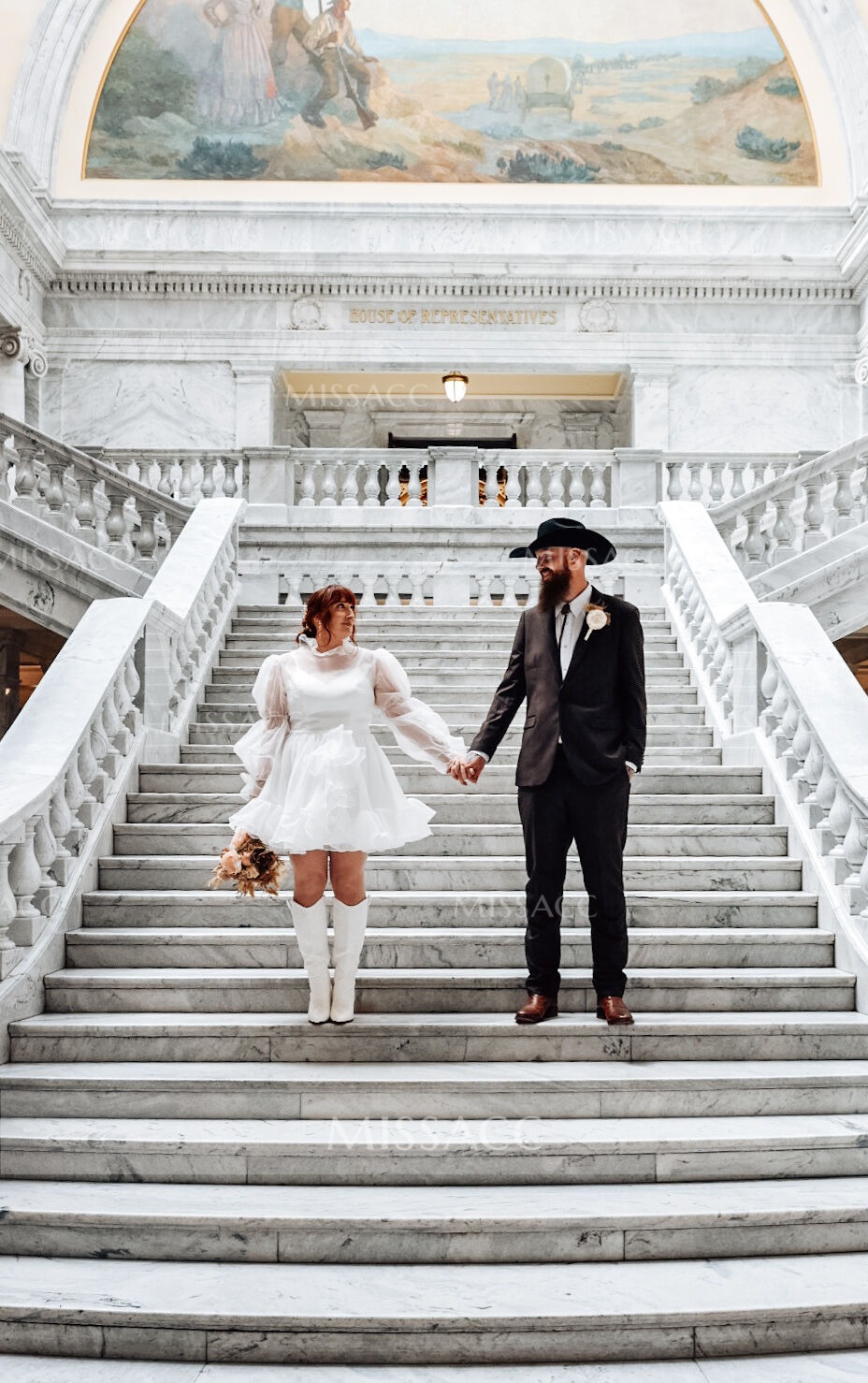 This mini white wedding dress features balloon sleeves, a high neck and ruffle trim. An A-line skirt can better show your lively and sweet personality. Back zipper closure makes it easier to put on and take off.It is the style of elopement wedding , bring you a different wedding experience.